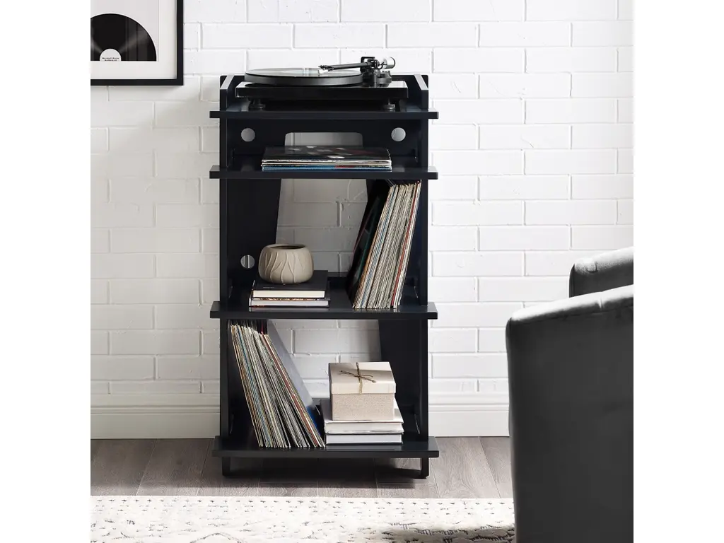 The soho by crosley is the music lover's ultimate turntable stand. the top shelf fits most component-style turntables and features two cable management holes to keep your set up tidy. the second shelf is perfect for your accessories: preamp, mini amp, cleaning supplies, etc. And features two more cable management holes. the bottom two shelves can hold up to 100 records each and feature bumpers in the back to ensure that the records sit uniform and are easily accessible. because details matter, there are two grooves to display the jacket of the record that’s spinning and space under the bottom shelf to keep your records away from the true enemy: dirt and dust. we’re confident that the soho turntable stand is the most thoughtful and affordable solution on the market.