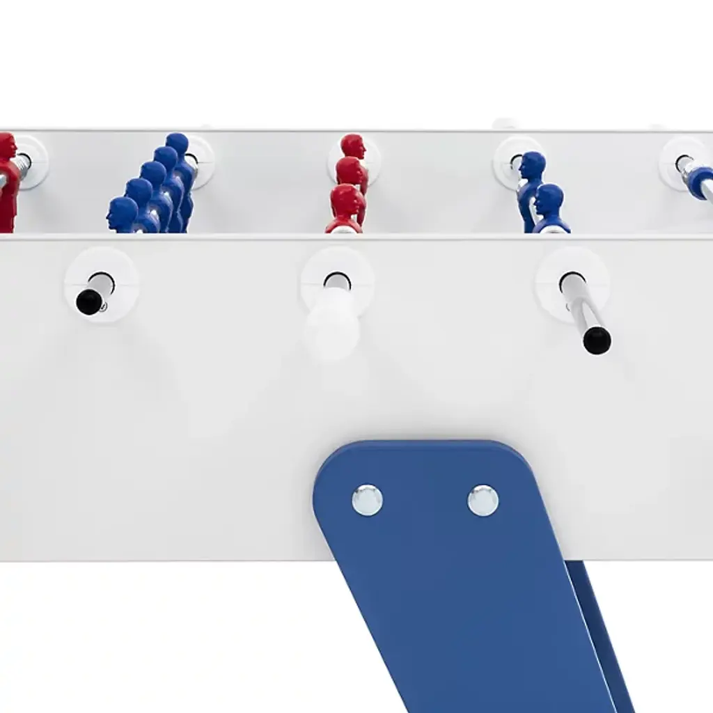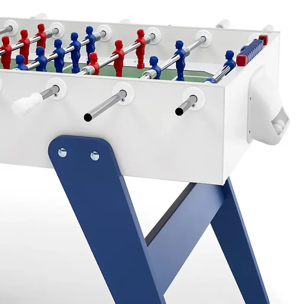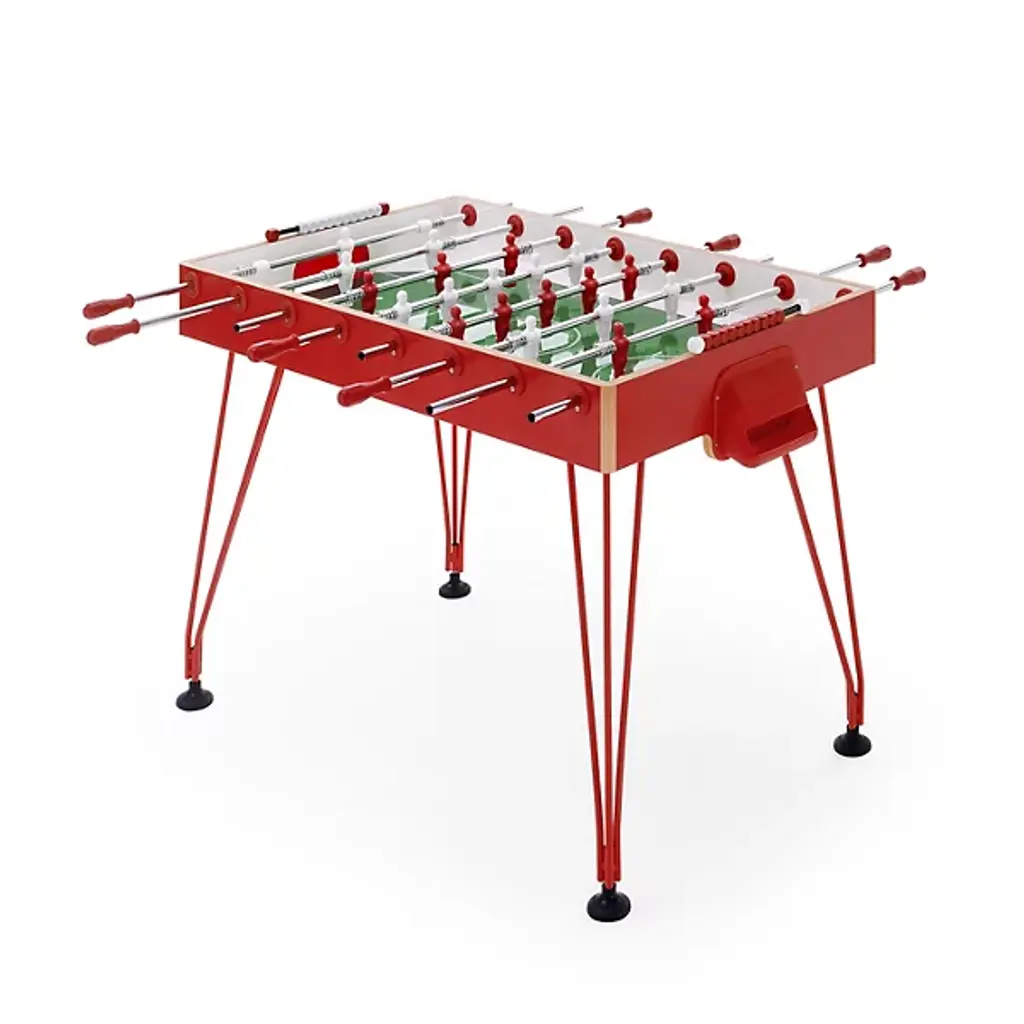 The Cross Foosball Table from Faz Pendezza is a contemporary take on the classic football game, underscored by its essential and familiar design elements. It complements the sophisticated home style with the clean linear silhouette of its angled legs. Connected with metal studs, the table's rectangular frame sports containers for easy retrieving of game balls. Telescopic rods pass through the frame with comfortable handles and charming figures. These colorful figures stand atop an elegant playing field covered in high-resistance tempered glass.