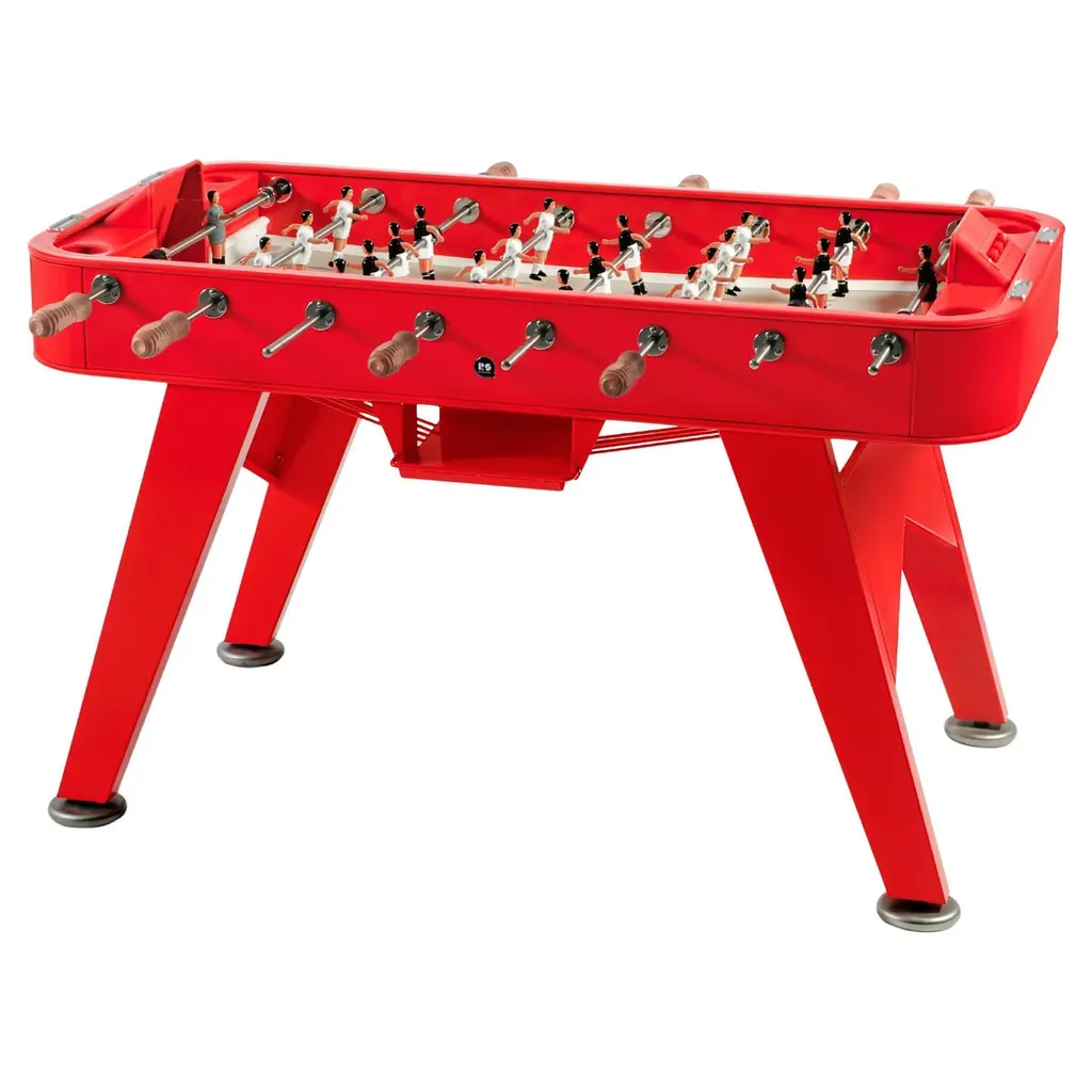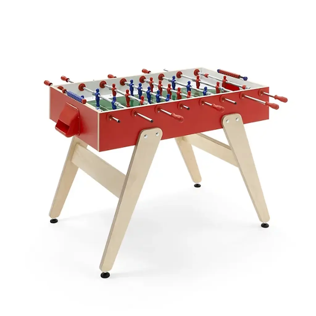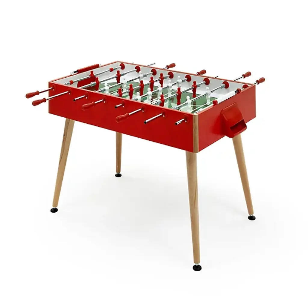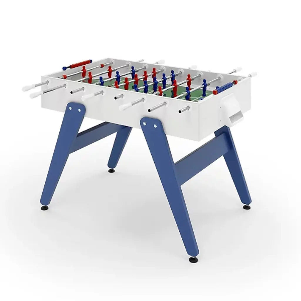 The Cross Foosball Table from Faz Pendezza is a contemporary take on the classic football game, underscored by its essential and familiar design elements. It complements the sophisticated home style with the clean linear silhouette of its angled legs. Connected with metal studs, the table's rectangular frame sports containers for easy retrieving of game balls. Telescopic rods pass through the frame with comfortable handles and charming figures. These colorful figures stand atop an elegant playing field covered in high-resistance tempered glass.