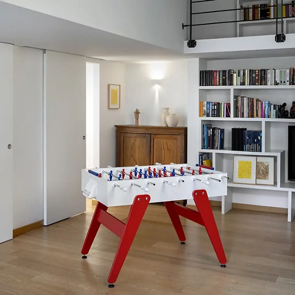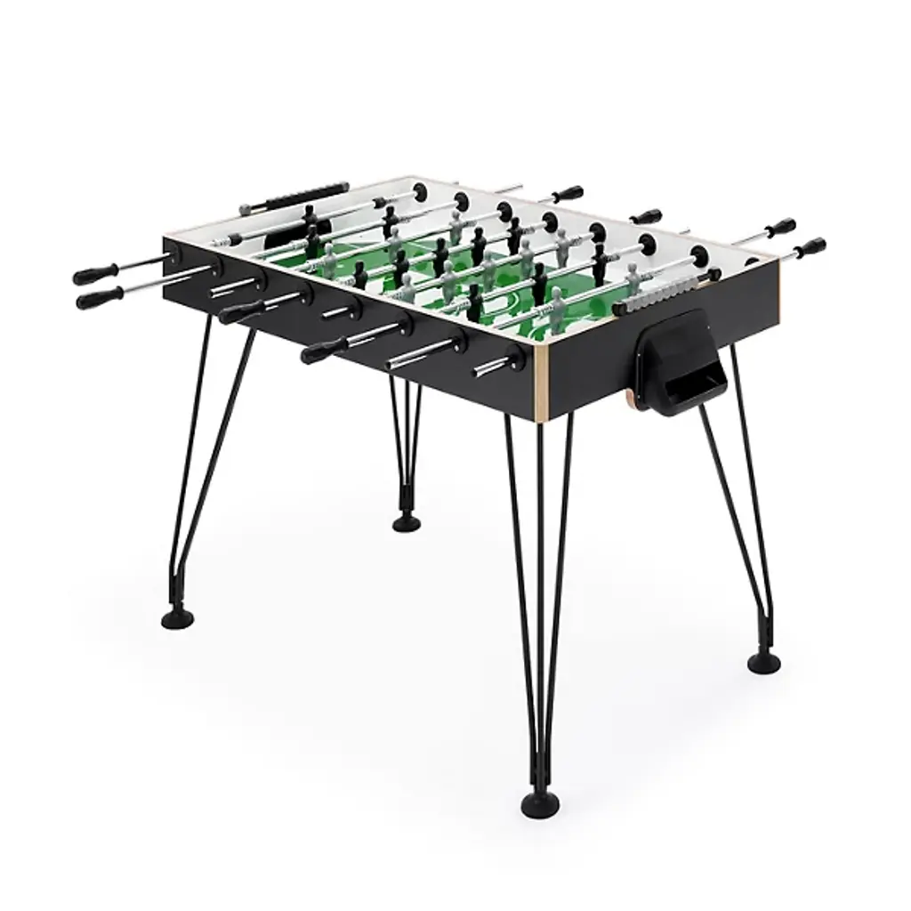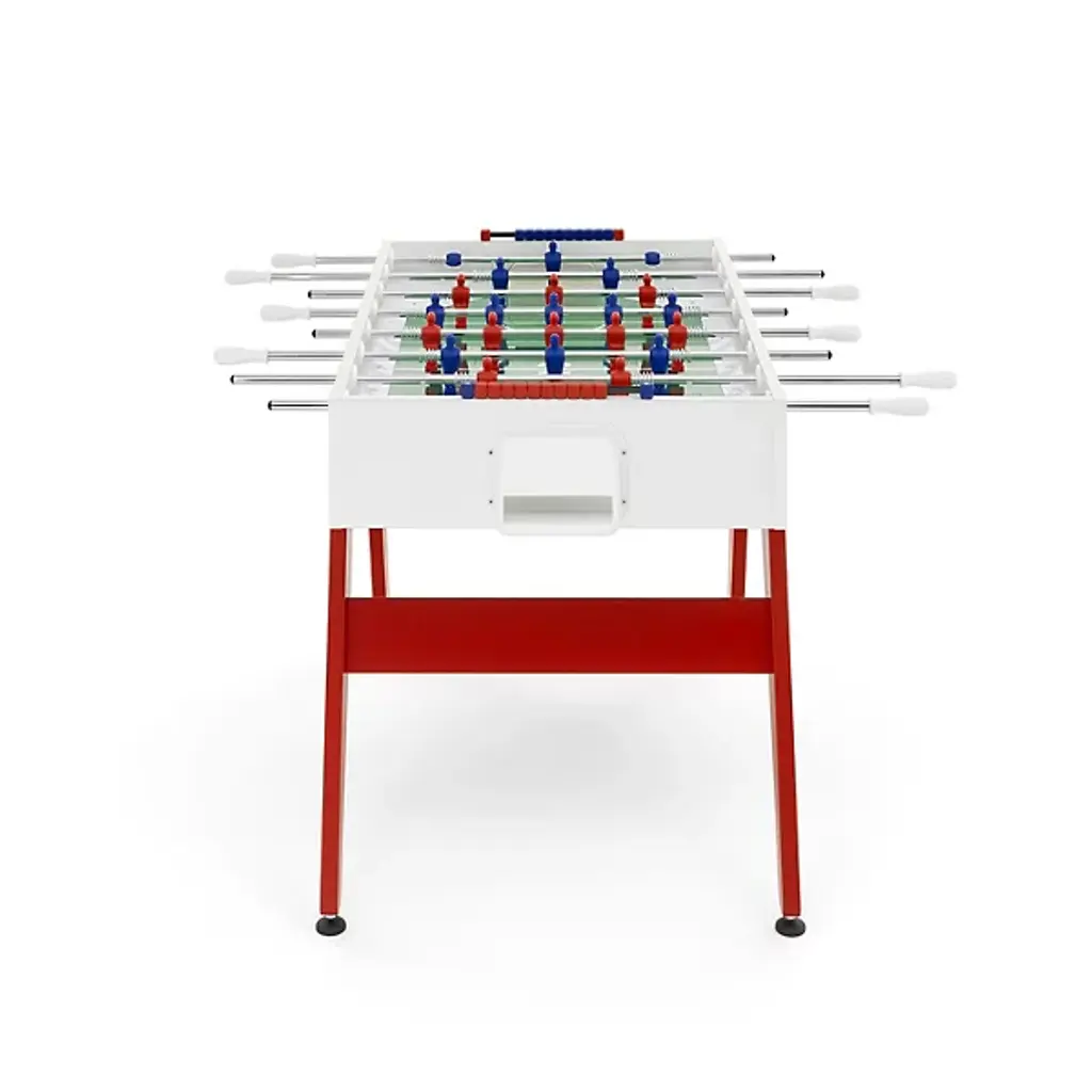 The Cross Foosball Table from Faz Pendezza is a contemporary take on the classic football game, underscored by its essential and familiar design elements. It complements the sophisticated home style with the clean linear silhouette of its angled legs. Connected with metal studs, the table's rectangular frame sports containers for easy retrieving of game balls. Telescopic rods pass through the frame with comfortable handles and charming figures. These colorful figures stand atop an elegant playing field covered in high-resistance tempered glass.