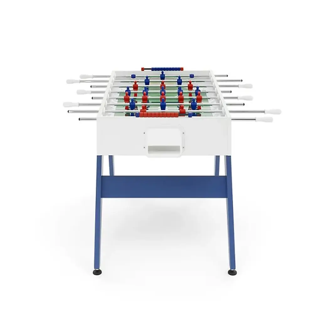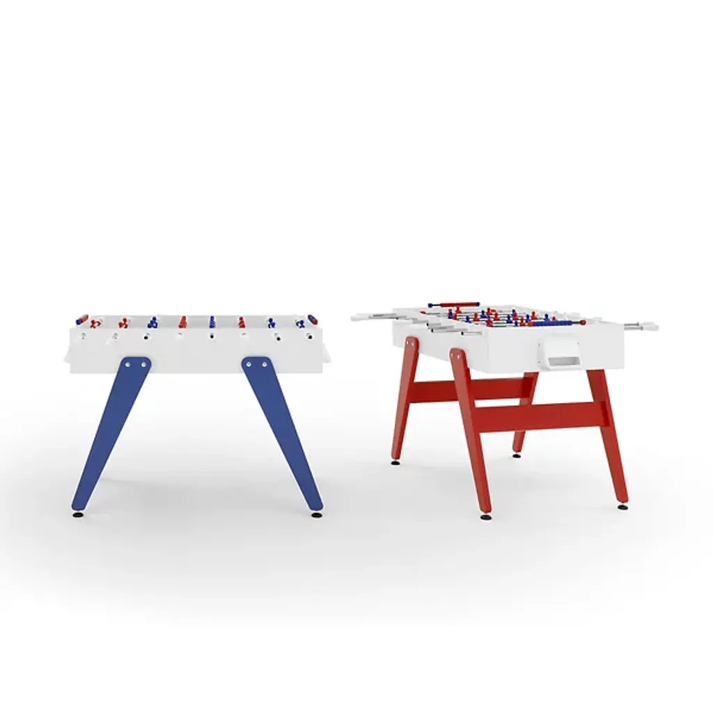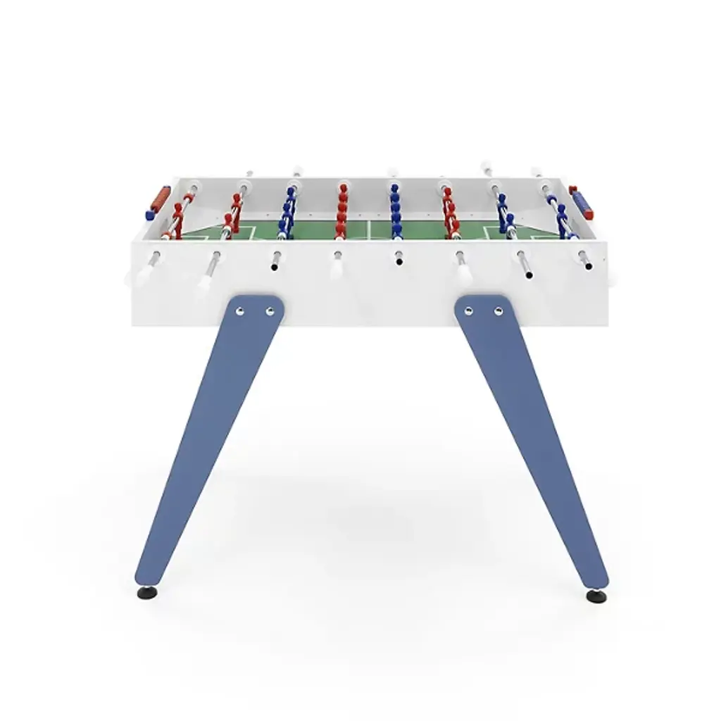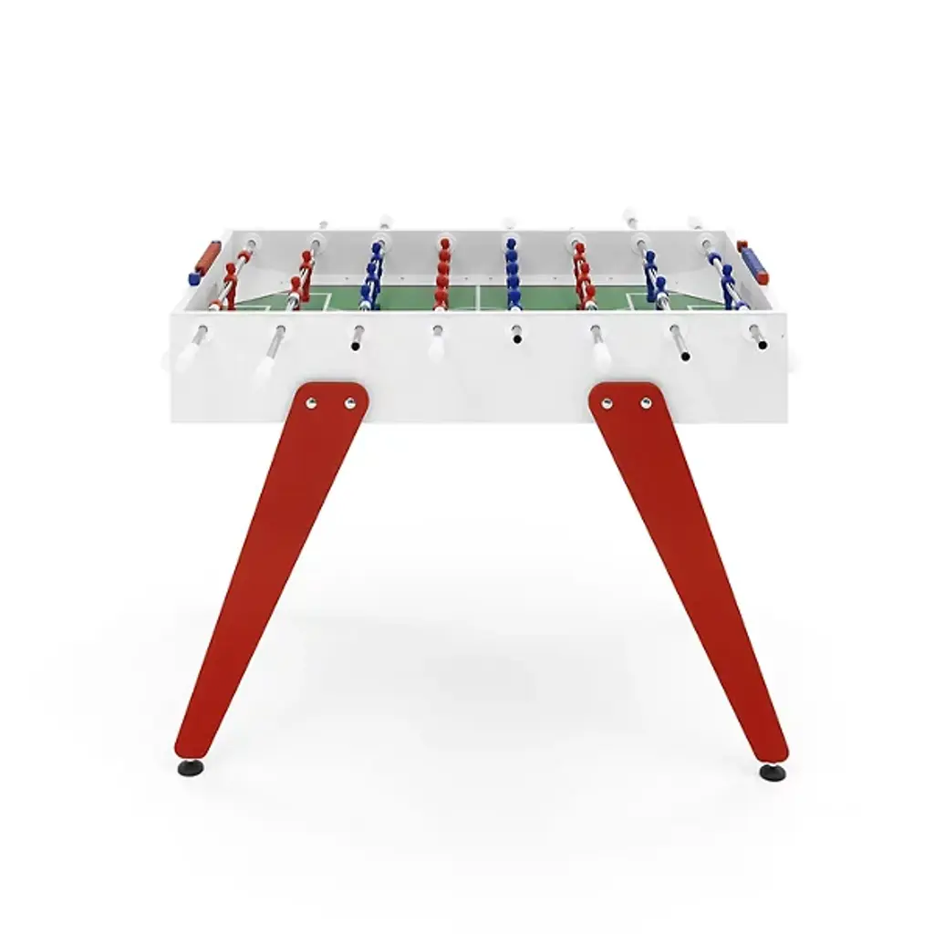The Cross Foosball Table from Faz Pendezza is a contemporary take on the classic football game, underscored by its essential and familiar design elements. It complements the sophisticated home style with the clean linear silhouette of its angled legs. Connected with metal studs, the table's rectangular frame sports containers for easy retrieving of game balls. Telescopic rods pass through the frame with comfortable handles and charming figures. These colorful figures stand atop an elegant playing field covered in high-resistance tempered glass.