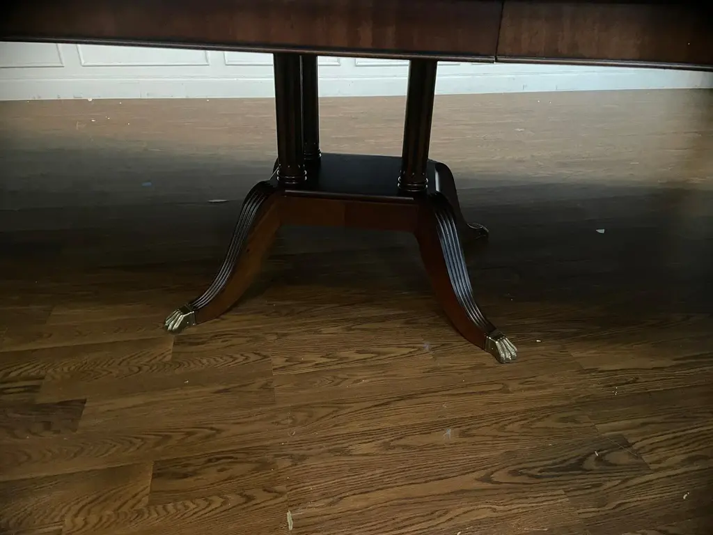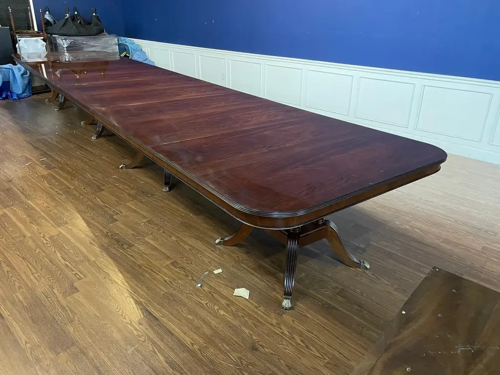 This is one of Leighton Hall’s premier banquet tables. It is made-to-order in the Leighton Hall shop in Suwanee, Georgia. It features a swirly crotch mahogany field with black/white inlay separating the field and border. It has a hand rubbed and polished semigloss sheen. The four pedestals are birdcage style with four posts and four legs each. Each leg terminates with an antique brass lion’s paw foot. In the table version shown (24 ft. version), the table comes in six large pieces which screw/bolt together. Dimensions: Length=288 in. (24 ft,), Width=60 in., Height=30 1/2 in.