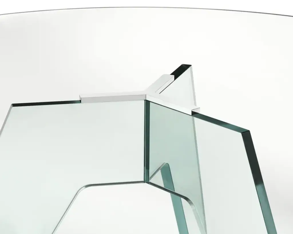 CRYSTAL TABLE is a table with a 19 mm transparent glass top and a 25 mm tempered transparent glass base, UV-bonded.The top and base are attached to each other and can be disassembled thanks to a sophisticated and elegant system of mirror-polished stainless steel plates, meticulously crafted in every detail.Discreet mirror-polished stainless steel feet complete and enhance the piece.