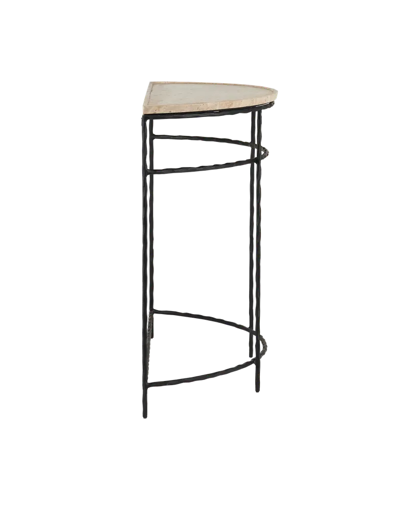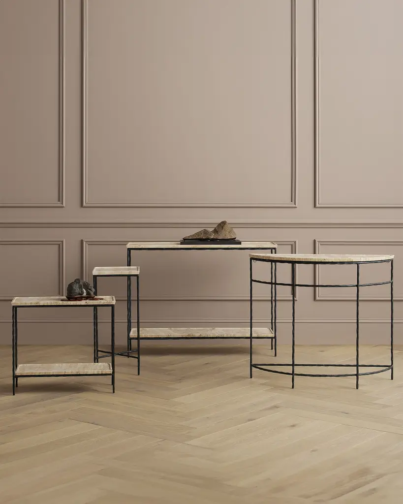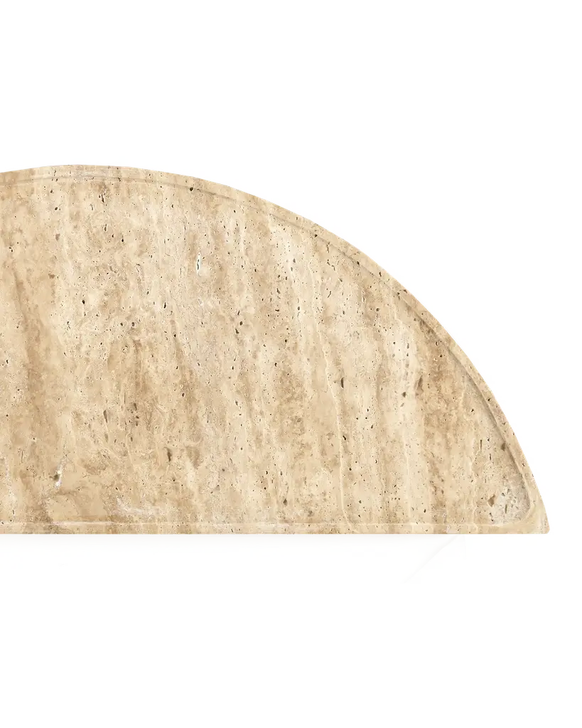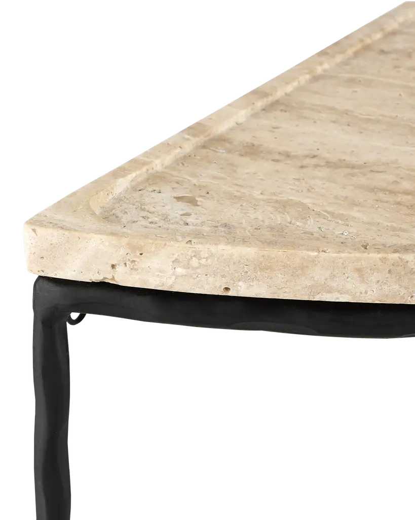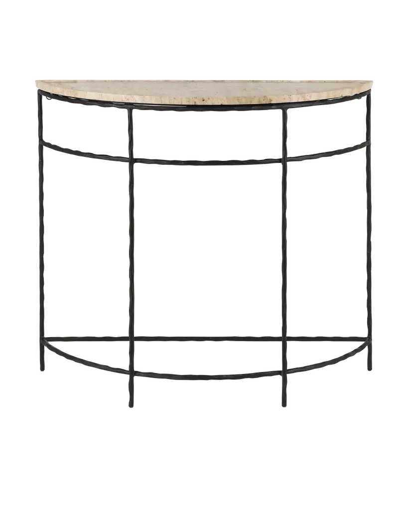 The Boyles Travertine Demi-Lune Table has a forged iron base in a black finish that holds a tray top made of solid, unpolished travertine. The personality of the surface stems from the fact that it is porous and has a variety of nooks and crannies in its pitting. Inherent variations in the stone's texture, veining, and color - from pale ivory to a warm tan - are to be expected and celebrated. Each surface is unique so no two are exactly alike. Wipe clean with a soft, dry cloth or static duster. Always avoid the use of harsh chemicals or abrasive cleaners as they may cause damage to the item's finish. Due to the use of natural materials, handmade craftsmanship, or hand finishing, expect some color variances. Hand crafted pieces may have slight size differences.