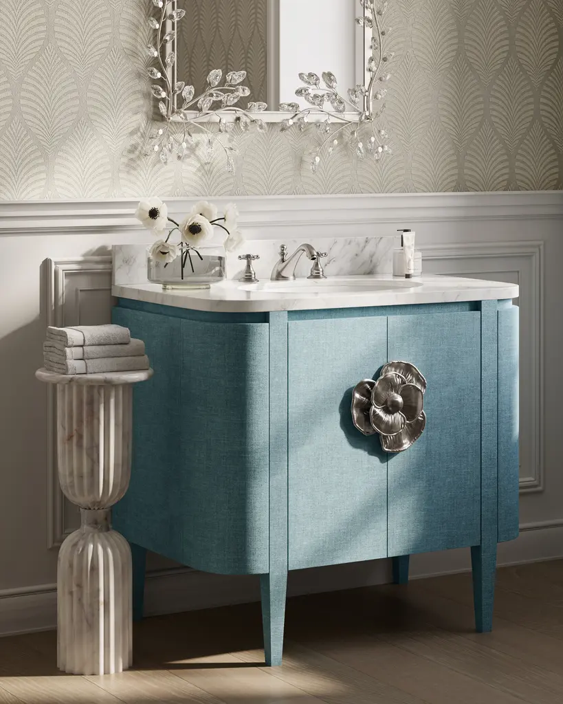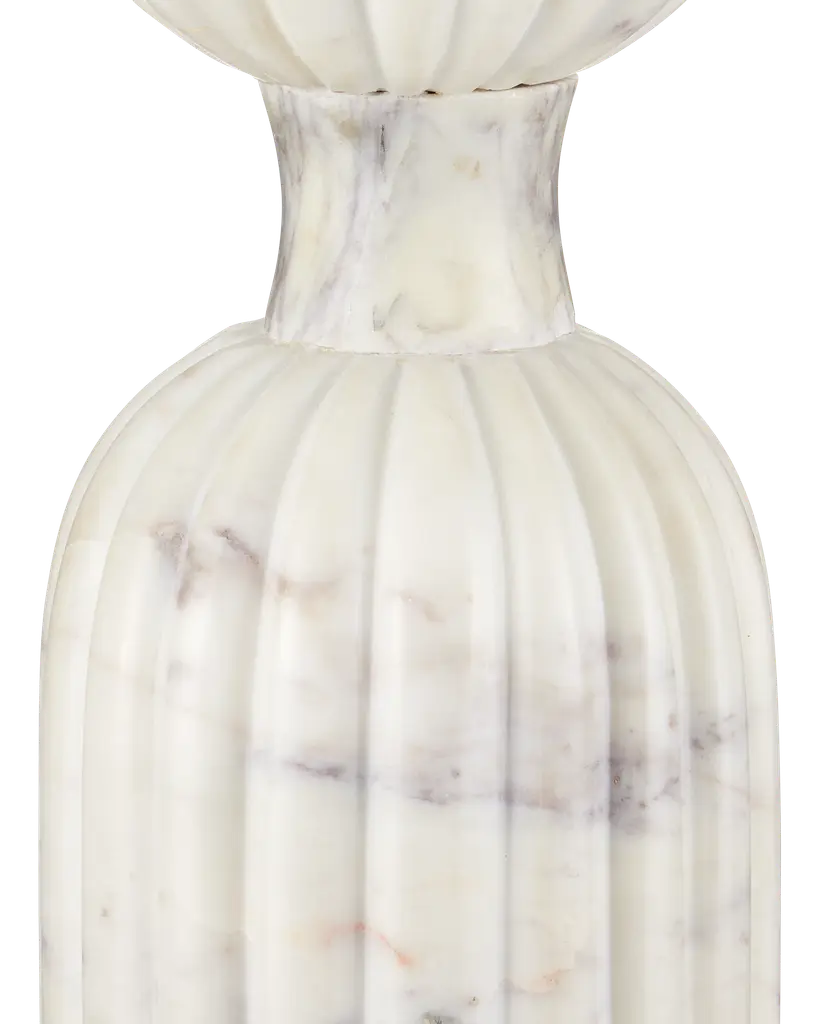 For a sculptural statement piece, the Passementerie Drinks Table is crafted from exquisite Banswara marble that is known for its striking white surface with subtle purple veining. The tall, slender design is a pair of interconnected tassels—one rising elegantly toward the tabletop and the other descending toward the floor—the two cinched in the middle to create a sophisticated profile. Wipe clean with a soft, dry cloth or static duster. Always avoid the use of harsh chemicals or abrasive cleaners as they may cause damage to the item's finish.