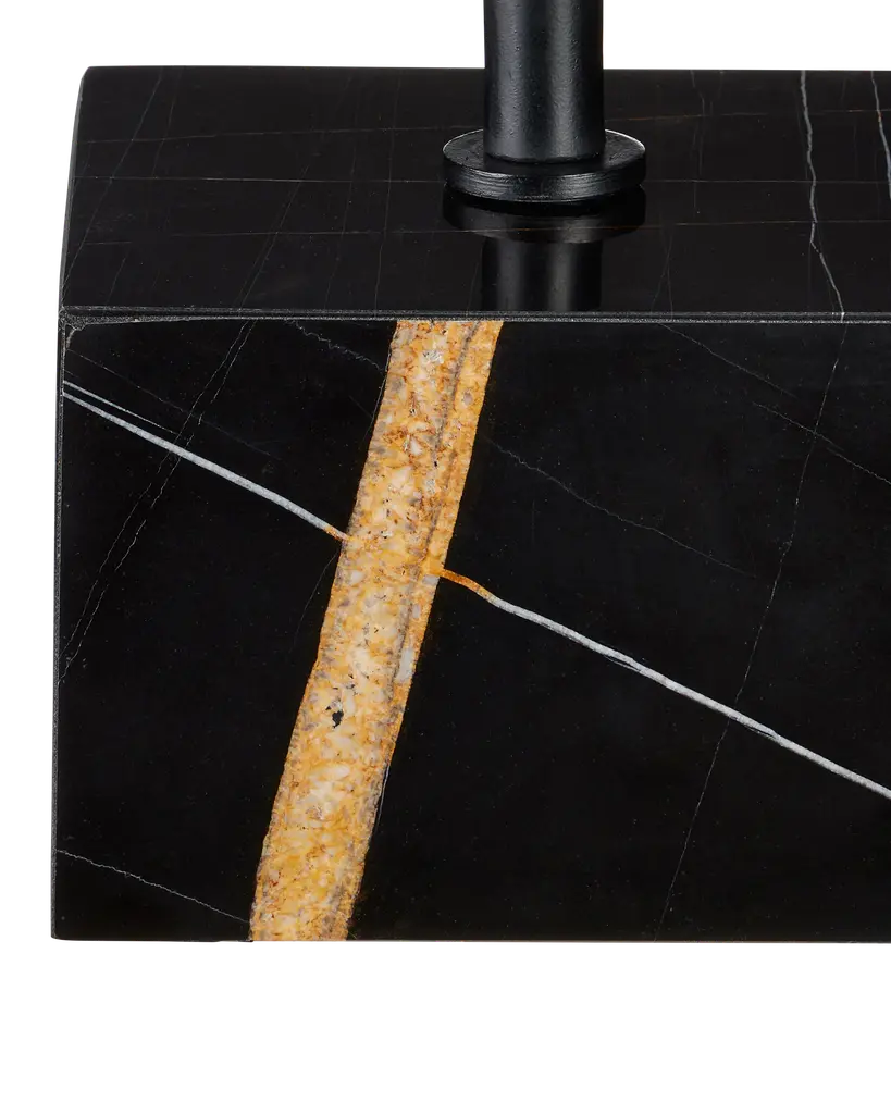 A true masterpiece of Mother Nature's doing, the Prado Drinks Table gleans its personality from the Nero Saint Laurent marble, imported from Italy, that forms its base and top. The striations of color on the blocky piece and the round disc, connected by a metal stem in a black finish, are artfully beautiful. Wipe clean with a soft, dry cloth or static duster. Always avoid the use of harsh chemicals or abrasive cleaners as they may cause damage to the item's finish.