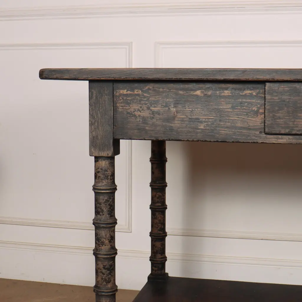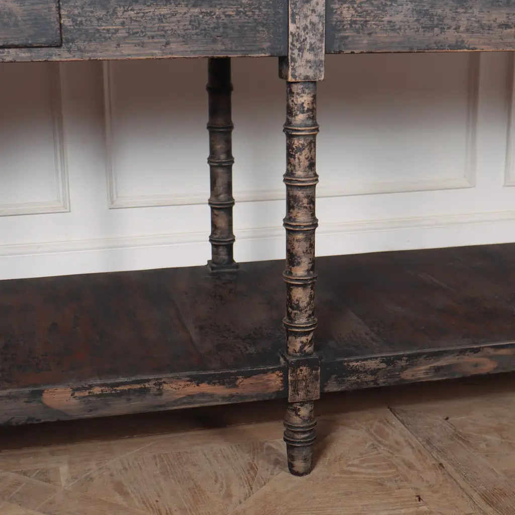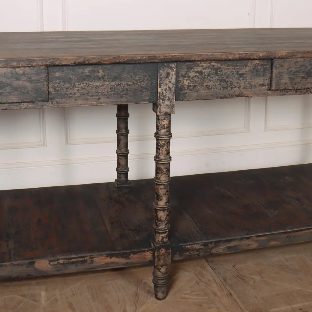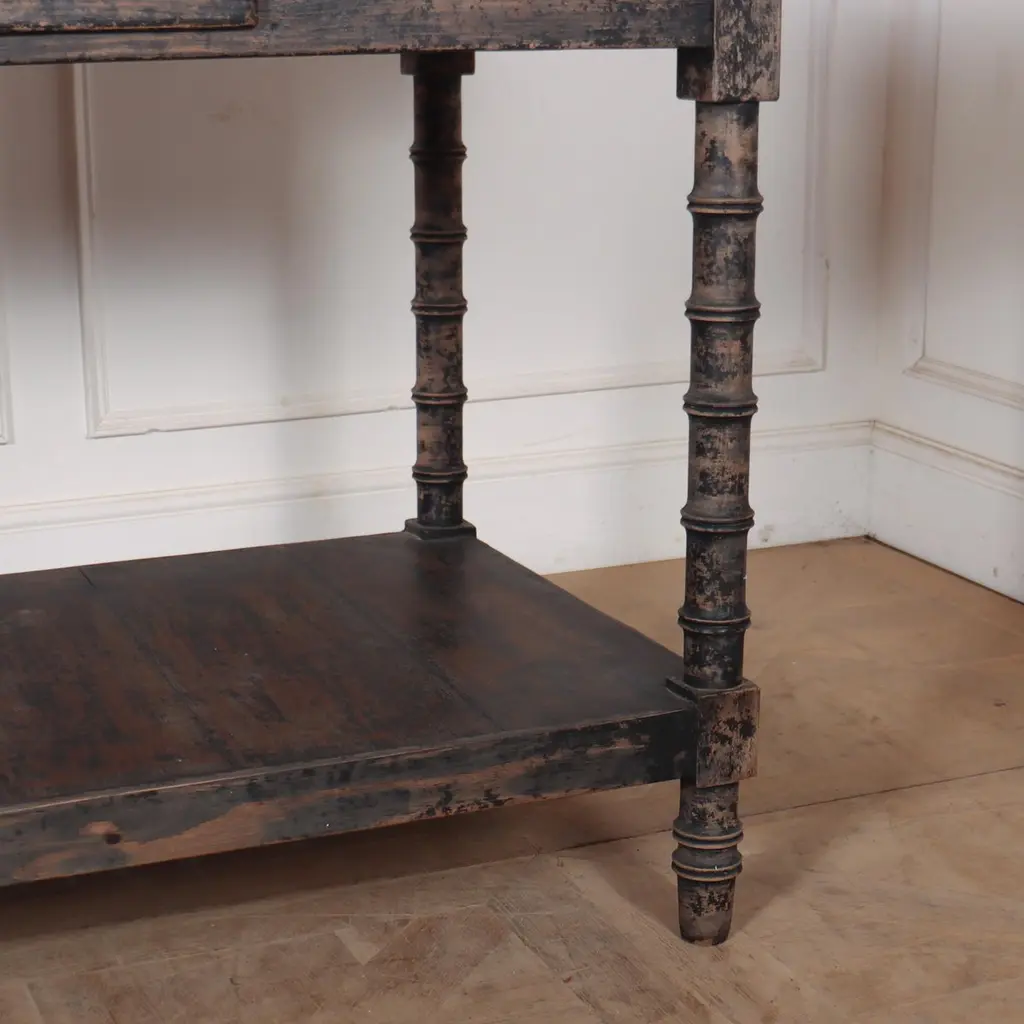 Custom made painted French style drapers table with faux bamboo legs. This drapers table is only available in the size shown online, other paint finishes are available. We use colours from the Farrow & Ball colour chart.Reference: 8101Dimensions108.5 inches (276 cms) Wide28.5 inches (72 cms) Deep35.5 inches (90 cms) High