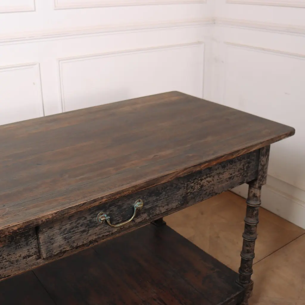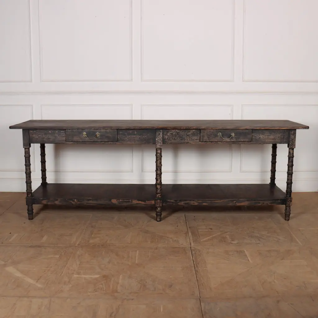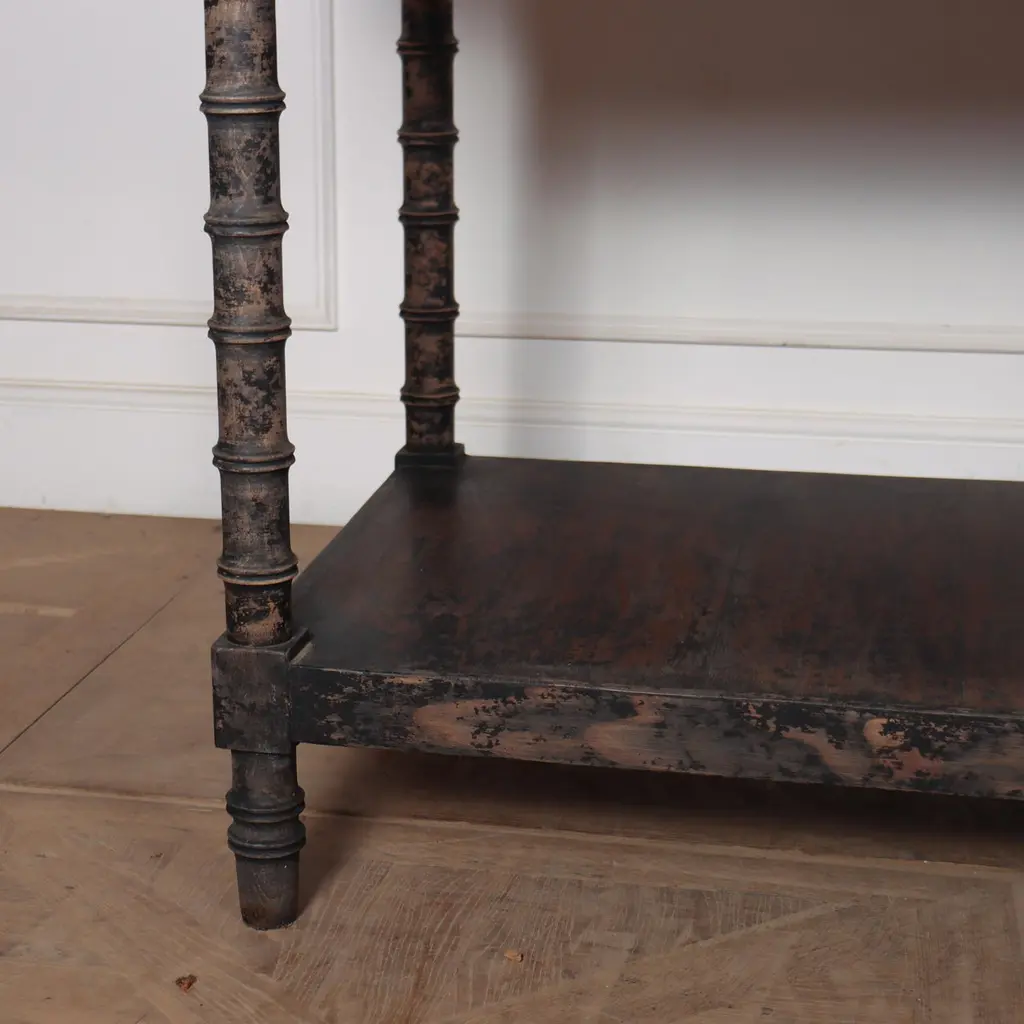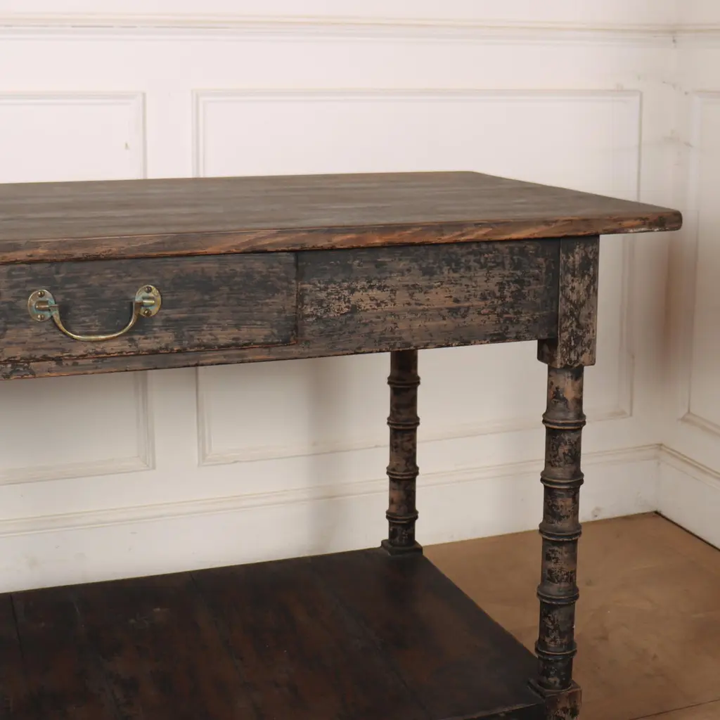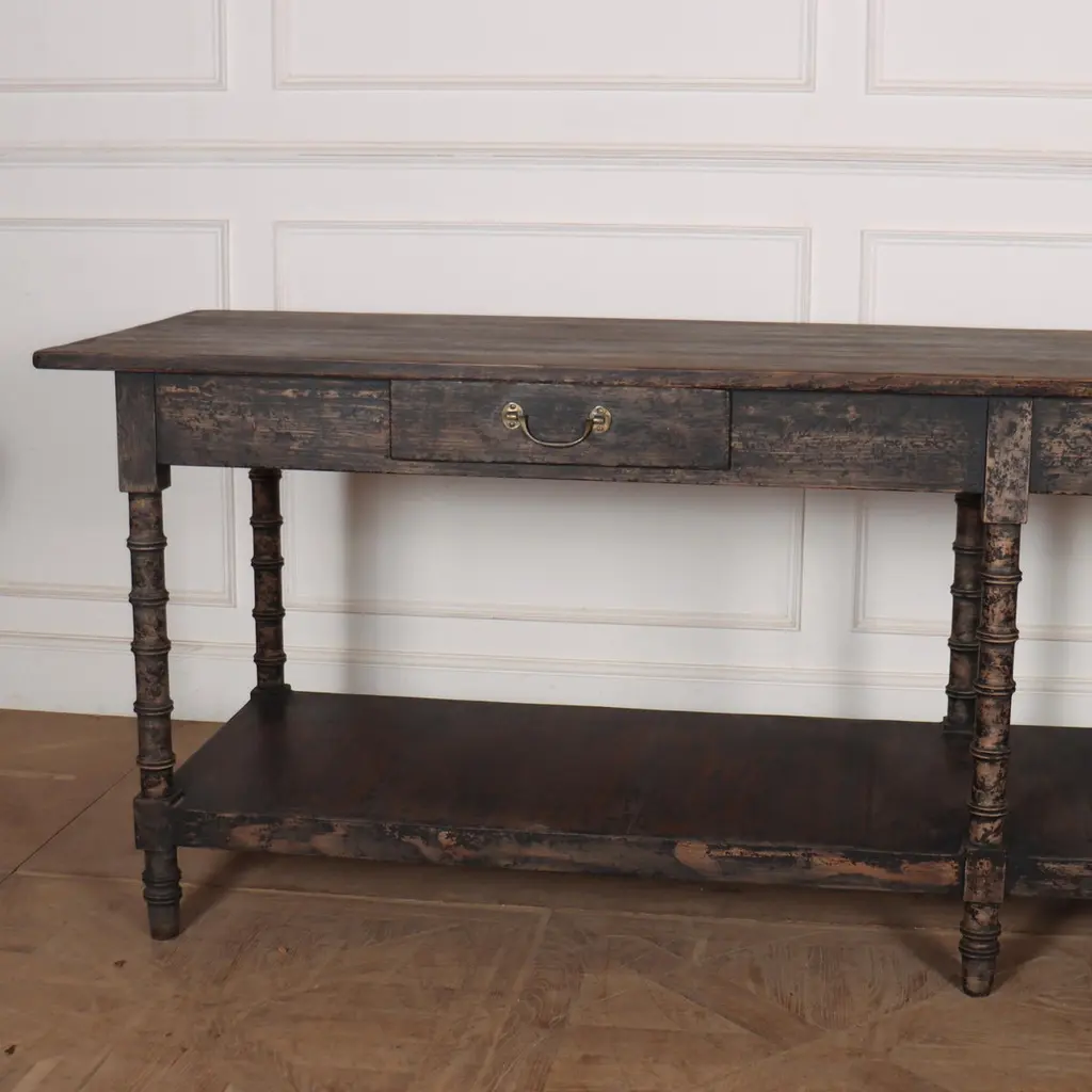 Custom made painted French style drapers table with faux bamboo legs. This drapers table is only available in the size shown online, other paint finishes are available. We use colours from the Farrow & Ball colour chart.Reference: 8101Dimensions108.5 inches (276 cms) Wide28.5 inches (72 cms) Deep35.5 inches (90 cms) High