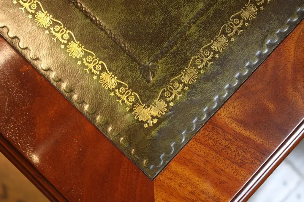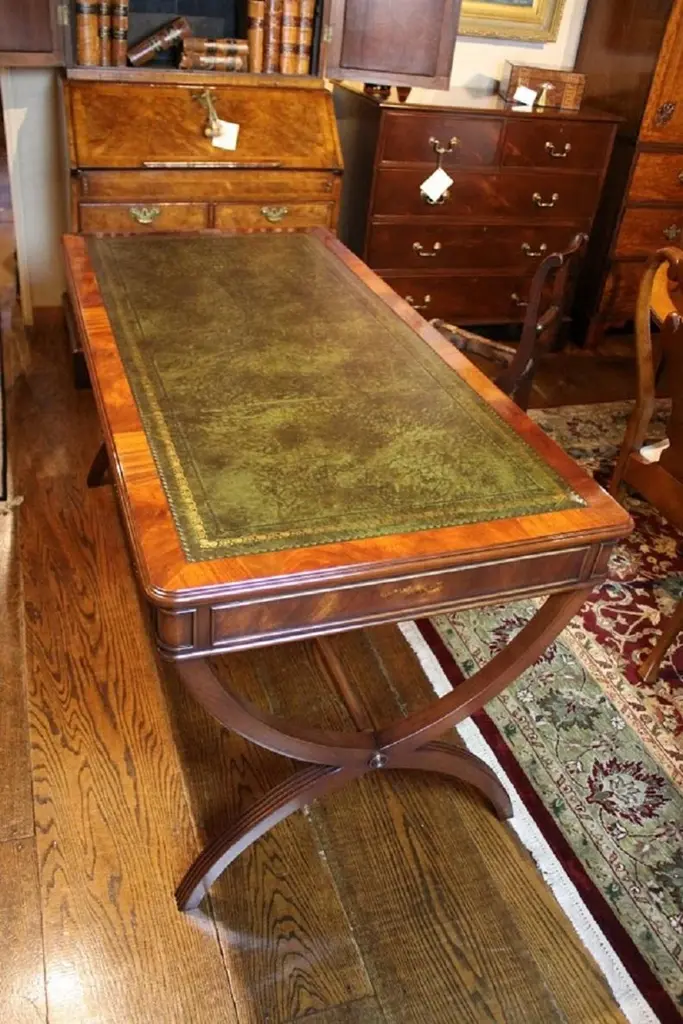 Bespoke English mahogany crossed sabre leg writing table with gold-tooled leather, hand-rubbed finish with subtle distressing. Three working drawers on one side and faux drawers on the other.