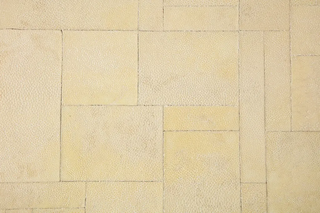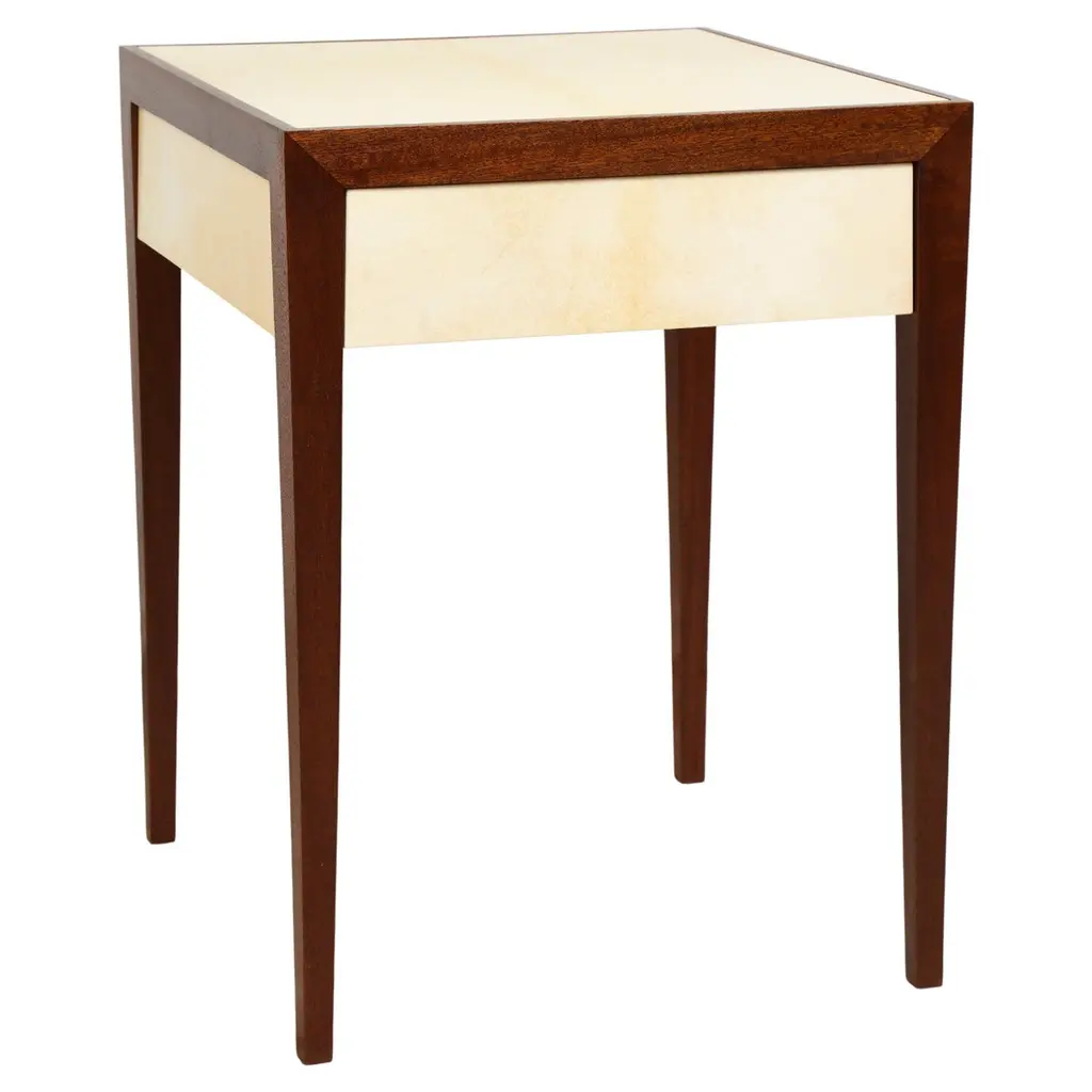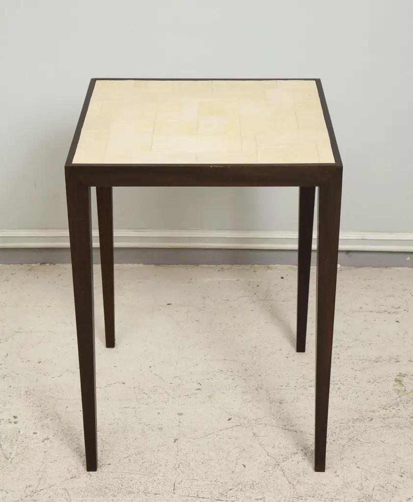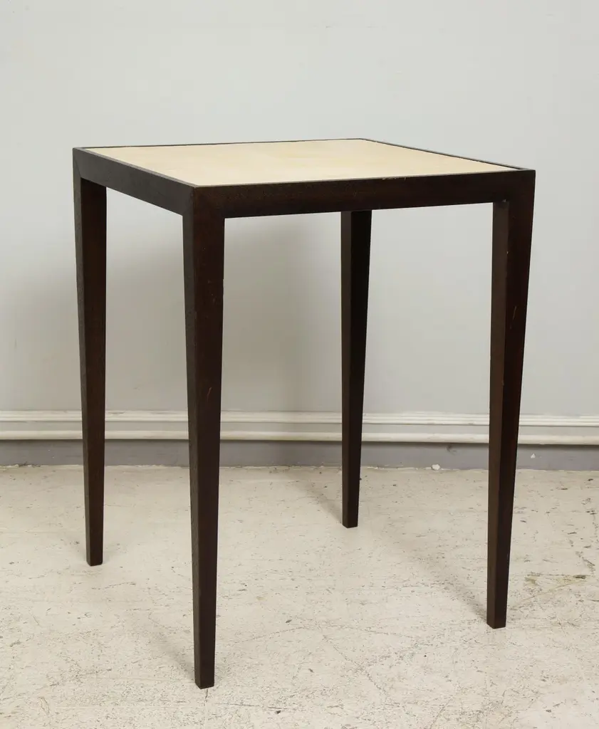 Custom mahogany table with shagreen top in the Jean Michel Frank Manner. Please note that this piece can be customized to your specifications. The table can be crafted in a variety of stain finishes and top options i.e. shagreen, parchment, leather, stain wood. Lead Time is 8-10 weeks.
