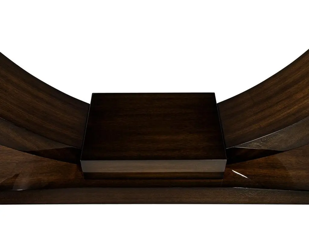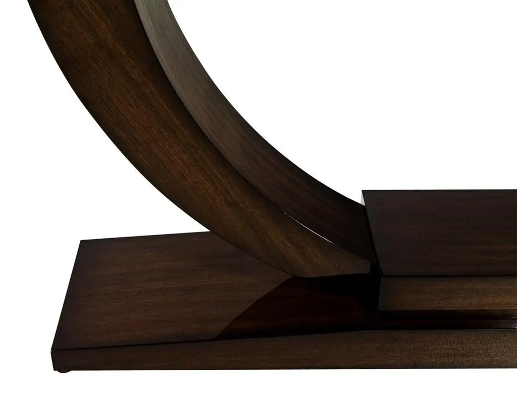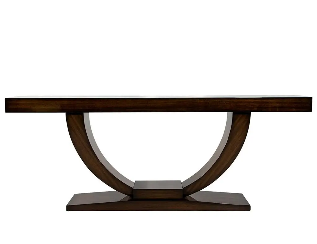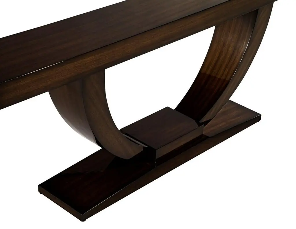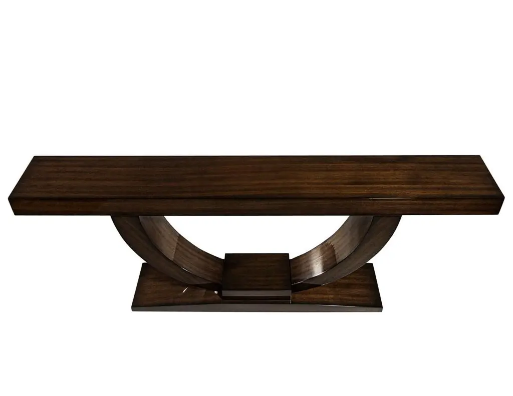 Introducing the newest addition to our collection of modern furniture, the custom art deco inspired console table. Hand-crafted with precision and care in Canada, this console table is a true work of art. Made from the finest quality walnut wood, this table exudes elegance and sophistication. The rich, dark walnut color of the high gloss hand polished finish adds a touch of luxury to any space. Each piece of wood is carefully selected and crafted to perfection, ensuring a durable and long-lasting piece of furniture. The unique curved pedestal base of this console table adds a touch of art deco flair, making it a stand-out piece in any room. The smooth and sleek lines of the base perfectly complement the bold and angular design of the table top, creating a harmonious balance of modern and art deco elements. This console table is not only a functional piece of furniture, but also a statement piece that adds character and style to any space. Its versatility allows it to be used in various areas of the home, from the entryway to the living room or even as a chic addition to a home office. Elevate your interior design with this custom modern console table, a showcase of exceptional craftsmanship and timeless design.Price includes complimentary scheduled curb side shipping service within the continental USA.