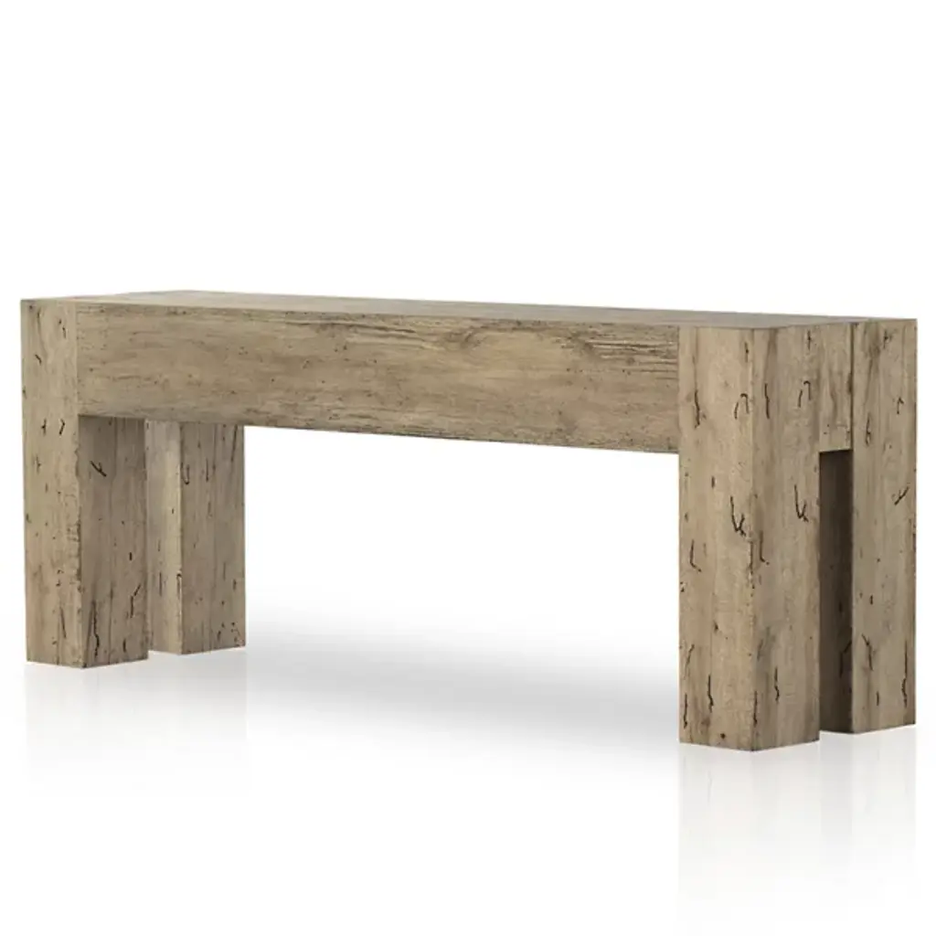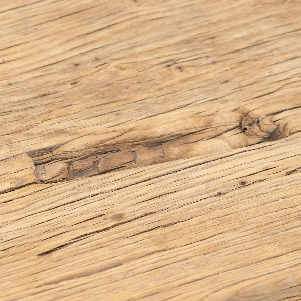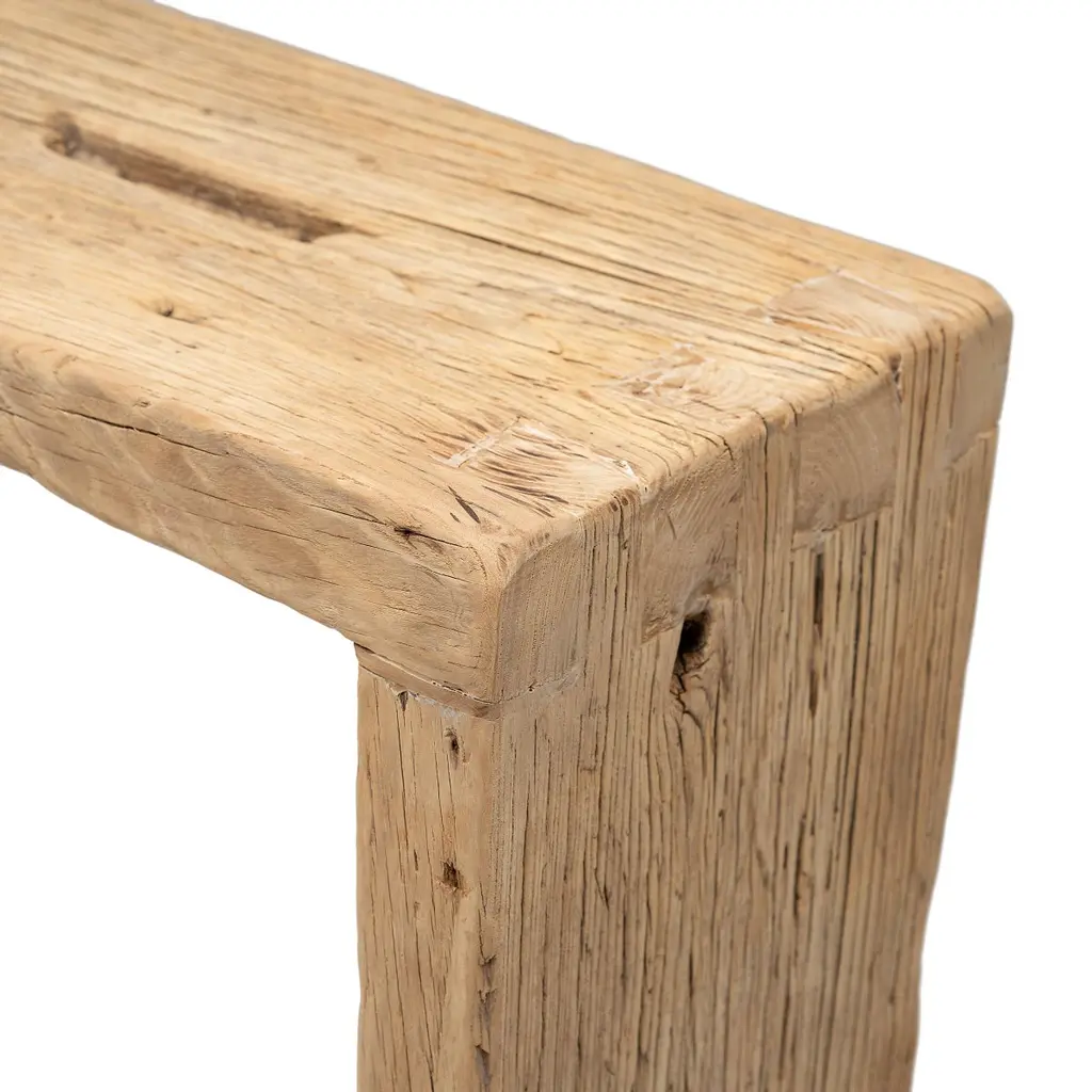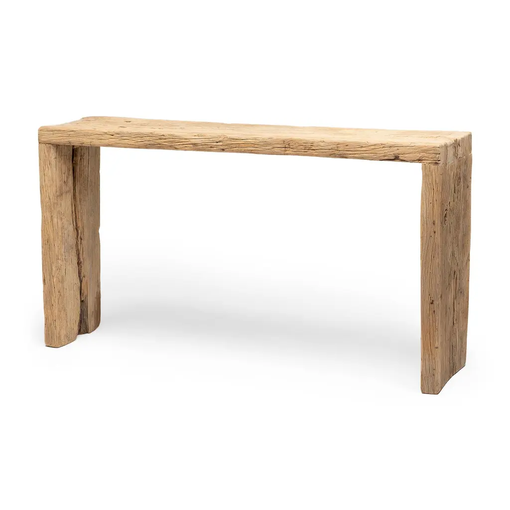 Our custom reclaimed wood console tables are hand-crafted by local artisans using architectural salvage from Qing-dynasty buildings. Each table is expertly crafted to a minimalist, waterfall design with traditional dovetailed joinery, without a single nail or screw. A celebration of organic, rustic and wabi-sabi styles, the clean lines highlight all the knots, grooves and colors of our one-of-a-kind elmwood timbers. Table is made to order to your custom size and finish. Lead time is 12-24 weeks. Pricing starts at $5,880. Payment required in full before production begins. Some additional charges may apply for size customizations. Our complimentary finishes, TOBACCO, COFFEE, and ESPRESSO are hand applied with tinted wax for rich color and a subtle sheen. NATURAL is simply the untouched raw wood carrying centuries of old patina. Each is a living finish that will change and develop over time.Additional Details: Maximum width is 96”L. Maximum depth is 15”D.Maximum height is 42”H.Custom finishes are a minimum up-charge of $1,000. Please reach out for more information on customizations and lead times.