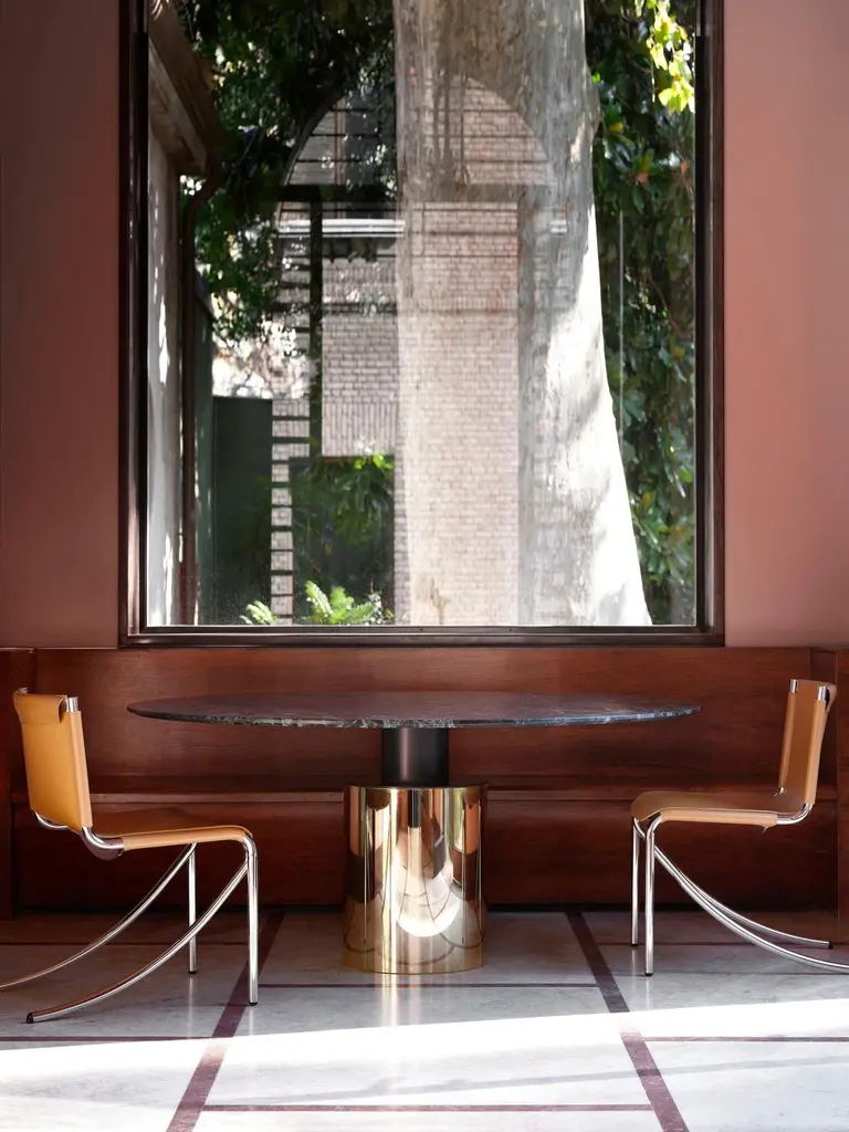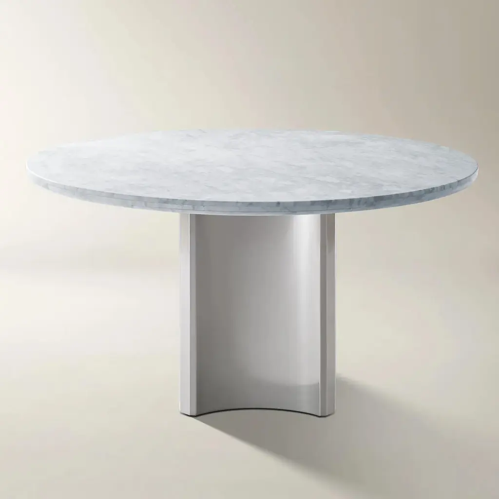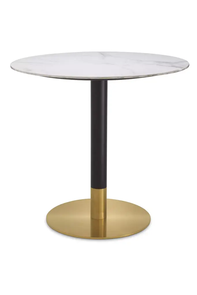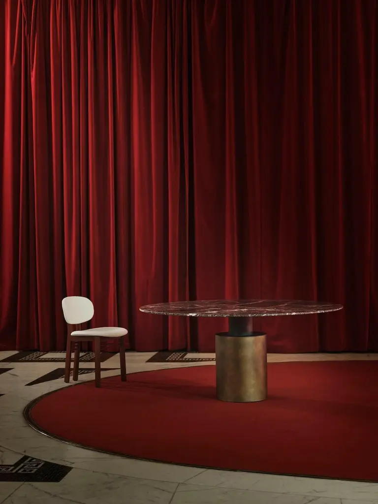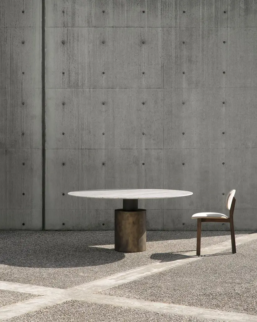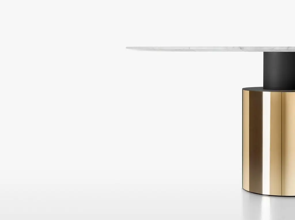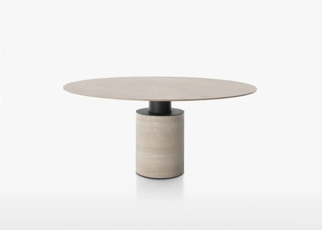A singular form with a monolith’s silhouette, the Creso table experiments with a sole pedestal of support to transform a table into the kind of vigorous geometry that defined the eye of Lella and Massimo Vignelli.Returned to a more faithful rendering of Vignelli’s ideas, the new Creso explores a use of materials that underlines the potency of the design, with its round top and pillar base crafted formidably in travertine, or topped by glass and marble, braced by a base with various metallic finishes.The surfaces are available in the following finishes:– Transparent glass, 15 mm thick;– White arabesque marble, black Marquinia, red Levanto, green Alpi, 20 mm thick; marbles with polyester glossy finishes are available upon request;– Matt Travertine, 20 mm thick (max Ø160cm), stone with a natural polished finish. The Travertine top is only paired with the base in the same finish. The cylindrical base (Ø40 and Ø50 cm) is made with a steel tube, painted in a gun-metal grey or orbital bronze finish, or clad with a brass-plated steel foil. Another variation is the single-material version in matte Travertine, made from a single block. An internal iron column supports the weight of the entire structure without negatively impacting the marble cladding.