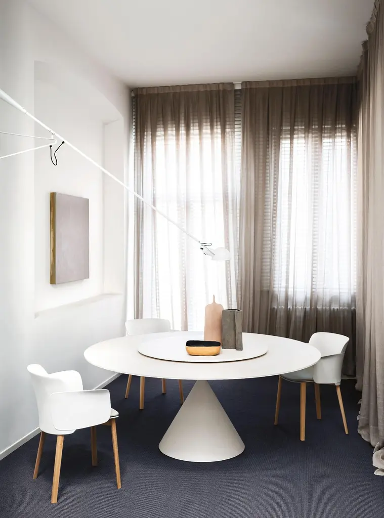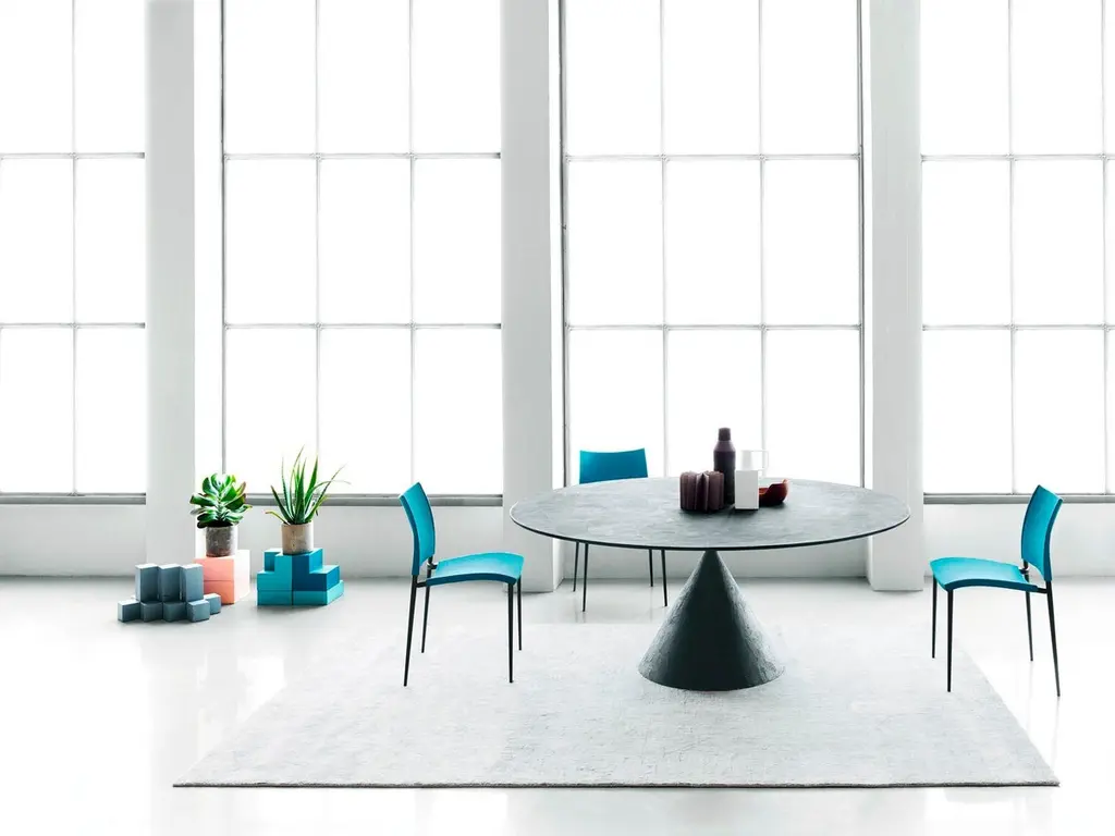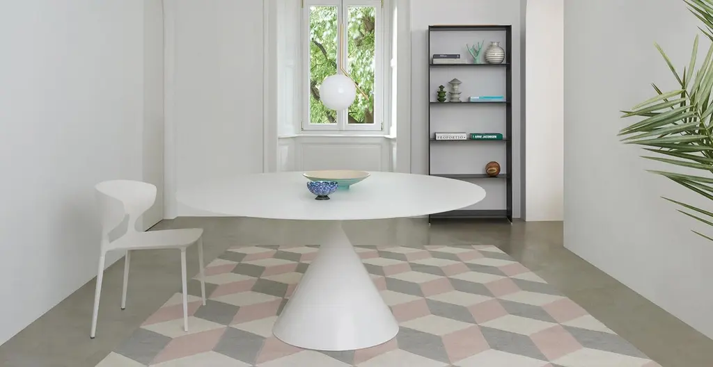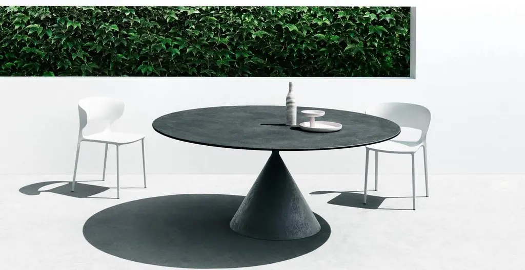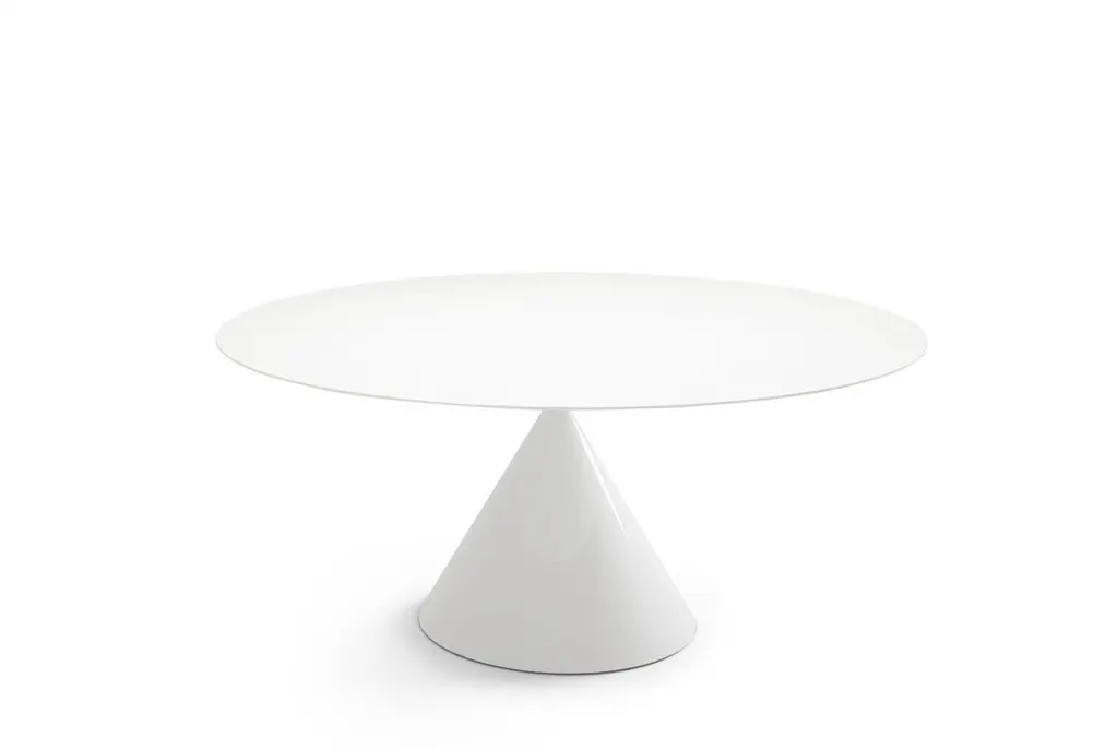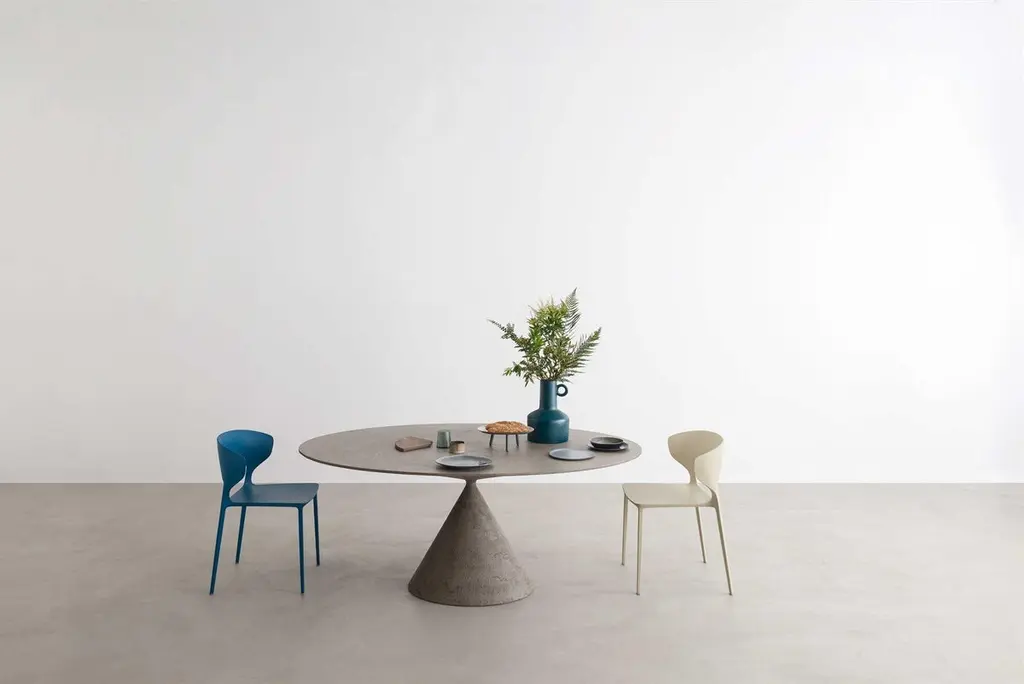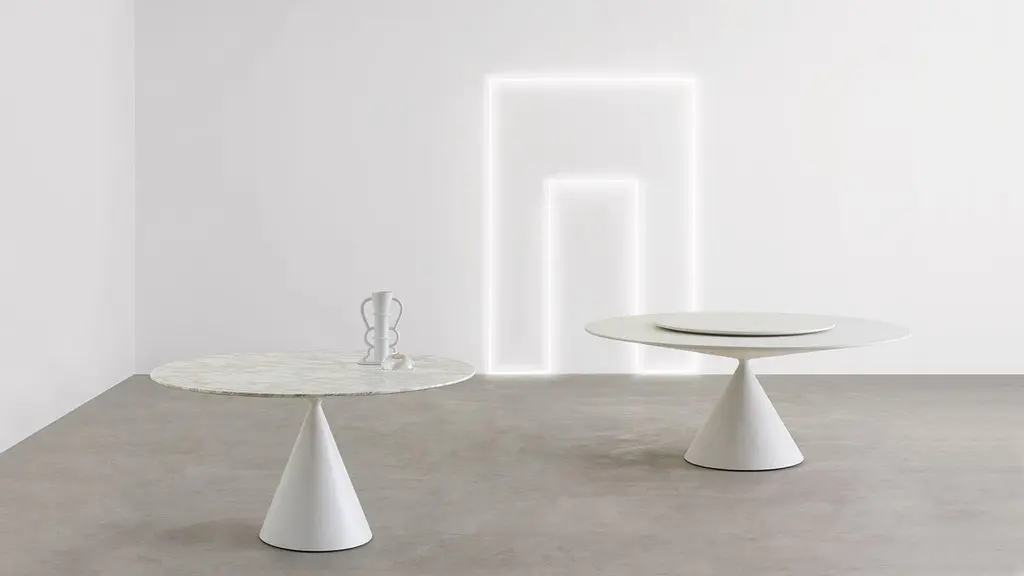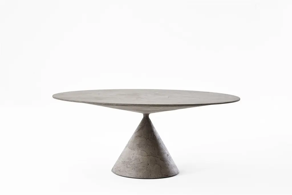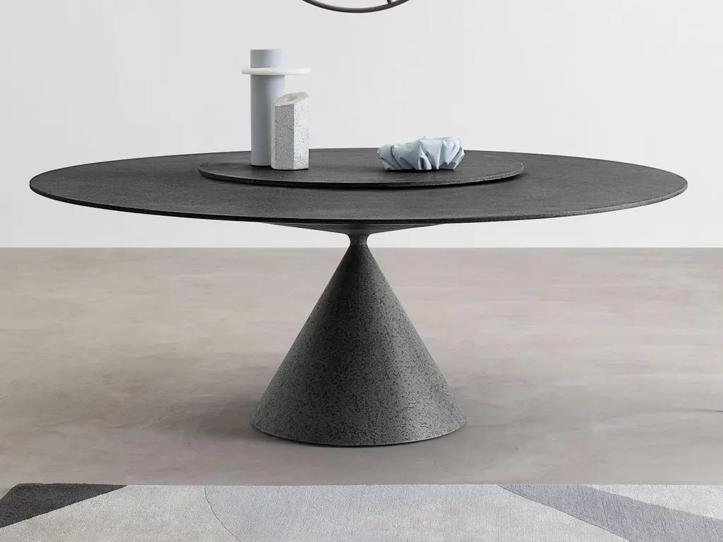 Table with rigid polyurethane base and MDF top, completely covered with hand-spread paste. Table height 75.5 cm.More than a table, a sculpture, a perfect union of beauty and harmonious proportions. Presented at the 2015 Milan Furniture Fair and winner of different awards: Iconic Design Award 2015, Good Design Award 2016, Red Dot Award for the 2016 Product Design category. The meeting of two volumes achieves a perfect balance of one over the other. Table with base in rigid polyurethane available in lacquered finishing or covered with hand¬spread materic finishes. Round or elliptical bases and tops. Tops of glass, ceramic, covered MDF or marble. Available in indoor and outdoor versions. “Lazy Susan” revolving tray centerpiece, upon request.