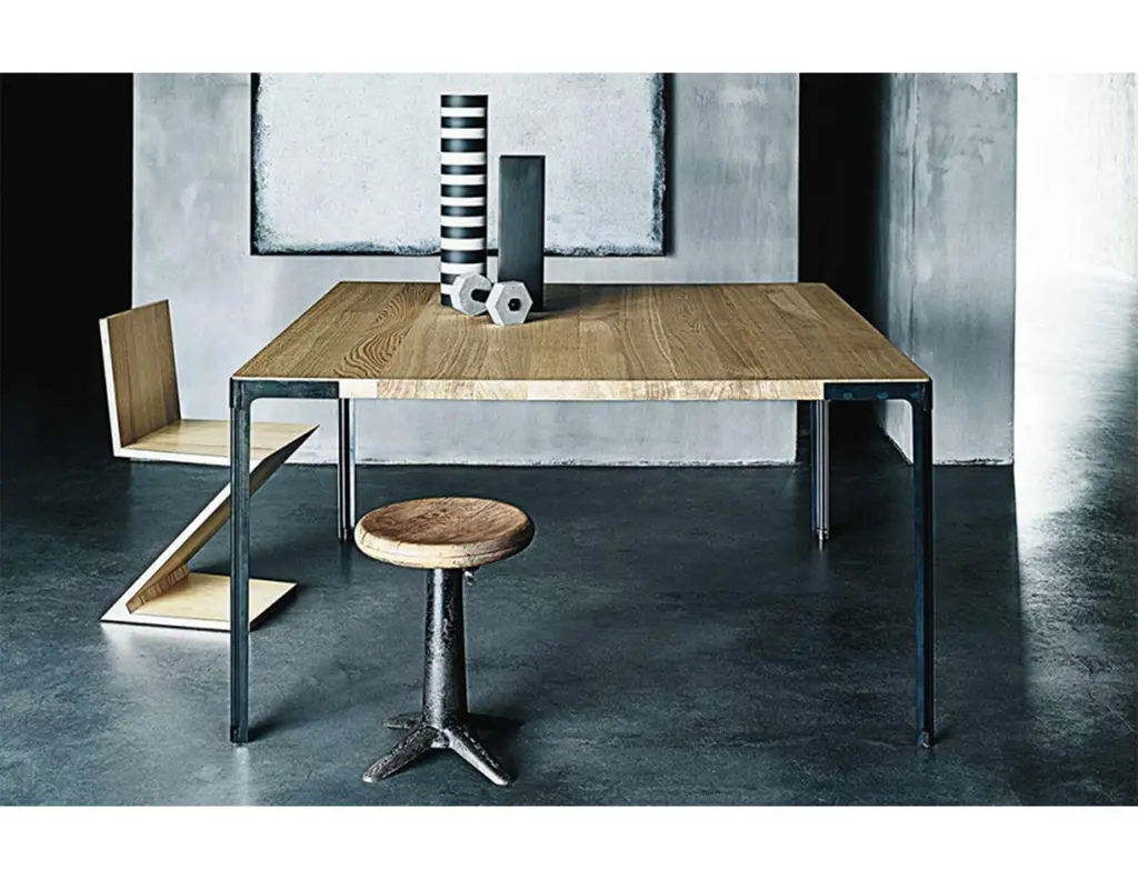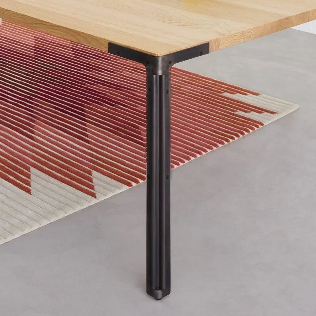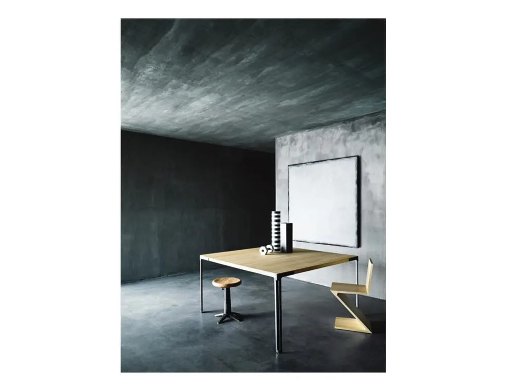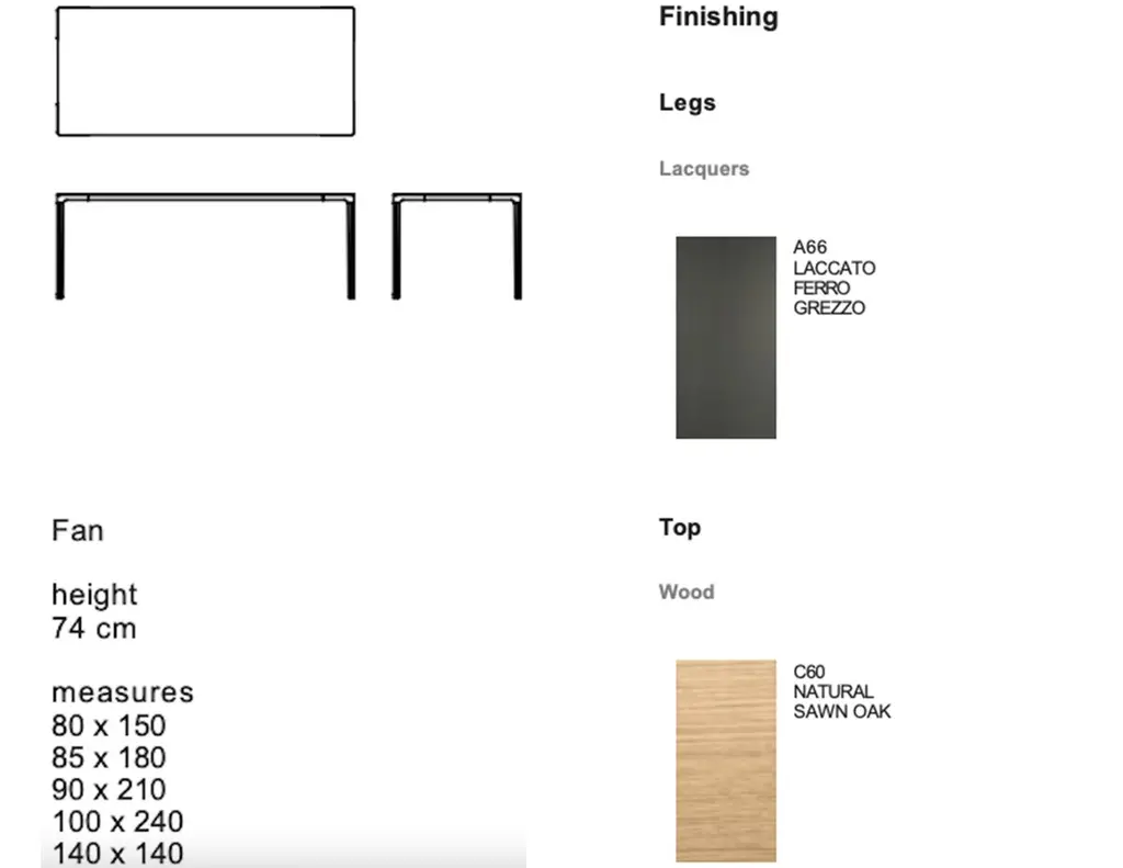 With the bold look of its sawn-effect oak top, the fan table displays a unique, precise style concept.The legs, too, convey an exclusive industrial language to enhance the uniqueness of this design.A clear concept gives life to a rigorous yet expressive collection.“The leg consists of a simple plate that a fold and a counterfold make structural, becoming its characteristic detail, taking on a very interesting industrial language”.Disassembling table with legs of metal sheet lacquered raw iron. Top made of solid oak wood with "sawn surface” finishing.Table with metal sheet legs.Solid wood sawn oak top, 40 mm thickness.The raw iron finish is achieved via a double coat lacquering, followed by a further hand-made sanding treatment.