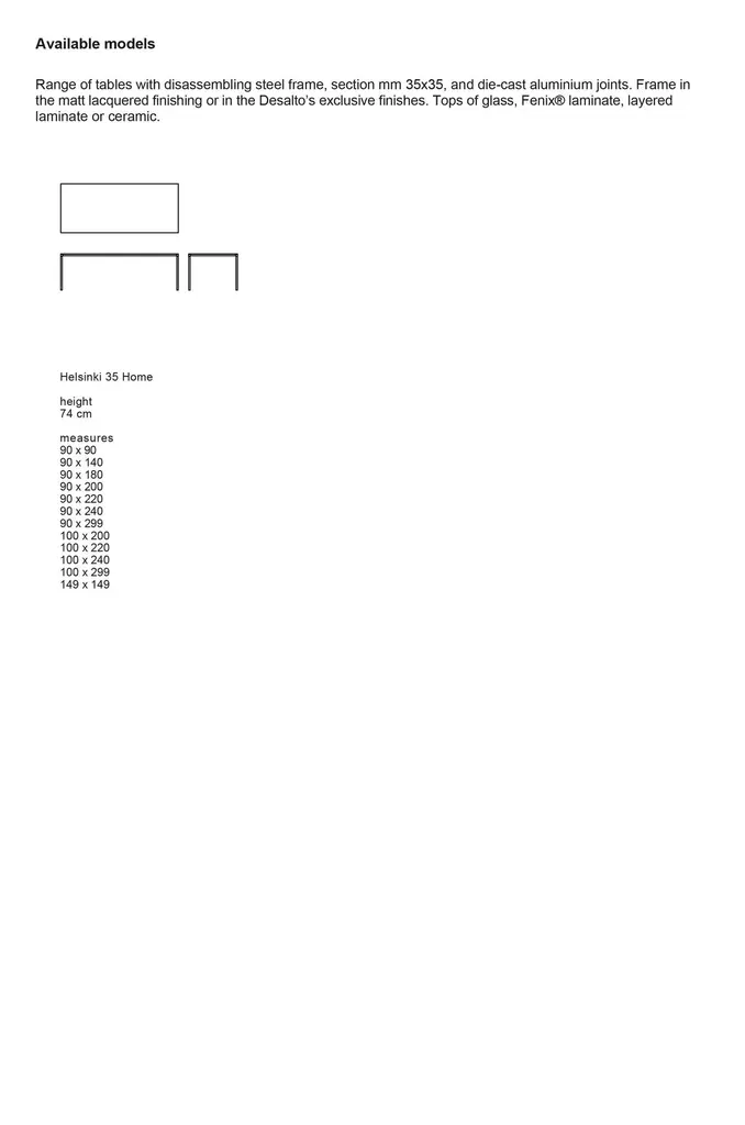 The project concept for Helsinki is so precise and strong as to continually allow new directions for this collection, which has long been one of Desalto’s bestsellers. A big assortment of dimensions, finishes, materials and accessories give rise to a large family that discreetly enters every environment of home, office, public spaces and outdoors.An extreme variety of sizes, finishes, materials and accessories to create a wide range of products that look good in any domestic setting, in the office, in contract locations and even outdoors.Range of tables with disassembling steel frame, section mm 35 x 35, and die-cast aluminium joints. Frame in the matte lacquered finishing or in the Desalto’s exclusive finishes. Tops of glass, Fenix laminate, layered laminate or ceramic.