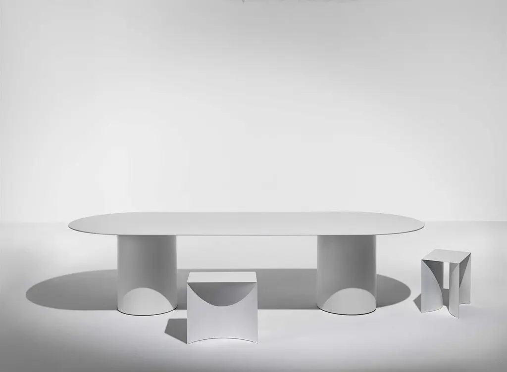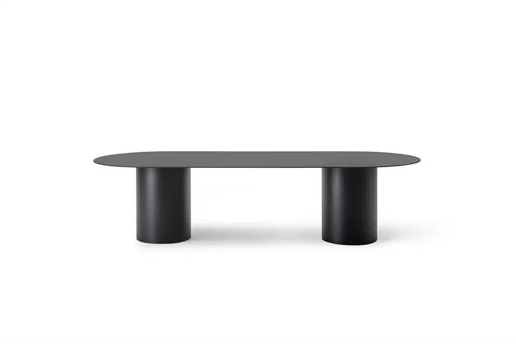 MM8 - Guglielmo Poletti, 2019The MM8 table explores the limits of material in relation to its structural properties, exploiting the physical qualities of aluminium. The construction brings an overall tension to the structure, allowing the top to reach a minimum thickness of 8 mm.The weights contained inside the two cylinders increase the rigidity of the surface, counterbalancing the forces in order to ensure high stability.The resulting composition gives the piece a strong monolithic presence highlighted by the accentuated contrast between the impressive volumes of the base and the extreme thickness of the top.