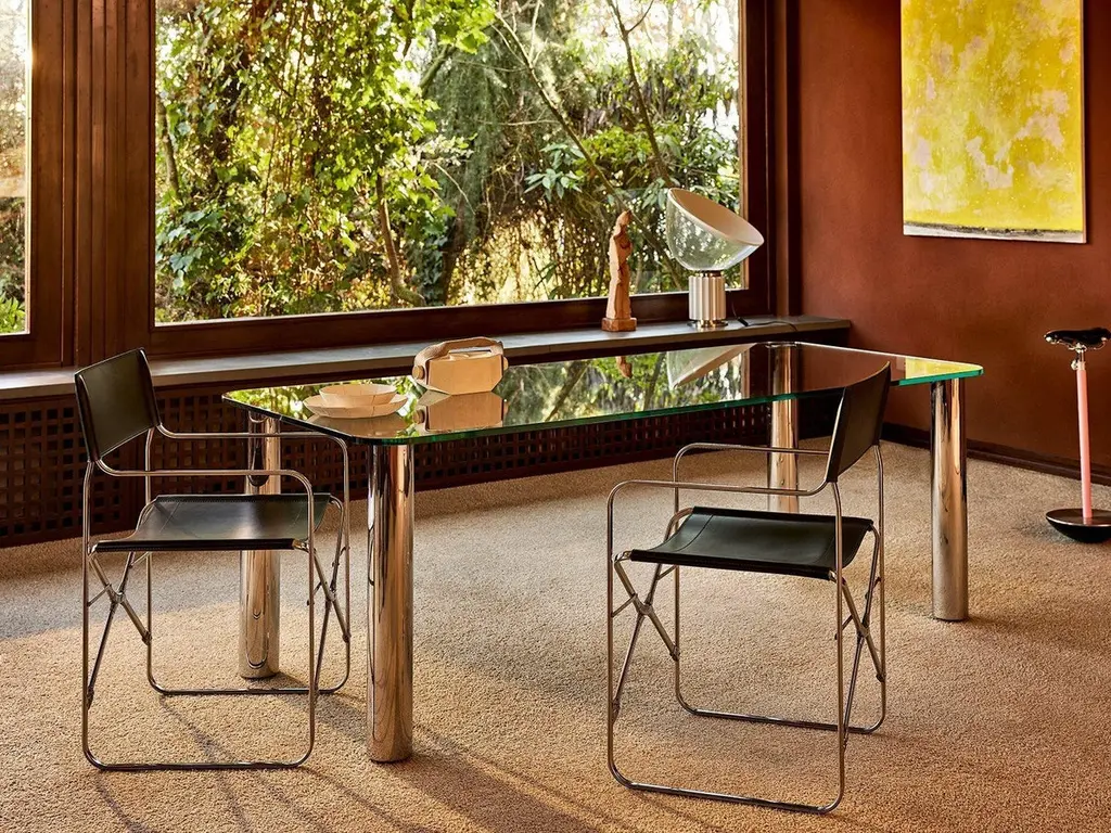 Table. Clear plate glass top. Stainless steel legs.At the end of the 1960s, Marco Zanuso – ‘design incarnate’ – came along. His gaze was caught by a car deflector, the type with the pawl glued straight onto the small piece of glass, and he imagined using that technology to, finally, surpass Marcel Breuer and all the others who had designed crystal-topped tables with traditional structures of legs and crosspieces. Marcuso changed everything. “Zanuso took the formal configuration of the object back to the fundamental geometries of the circle, square and rectangle. Having found the technology to directly weld crystal and steel together, the design process was oriented towards finding a way to attach the supporting legs to the surface top, resulting in a stainless steel base with one side fixed to the crystal top, and the other screwed to the steel leg” (Stefano Casciani). A table innovative in its construction, with the ability to be dismantled, “conceived and constructed like a modern building.”
