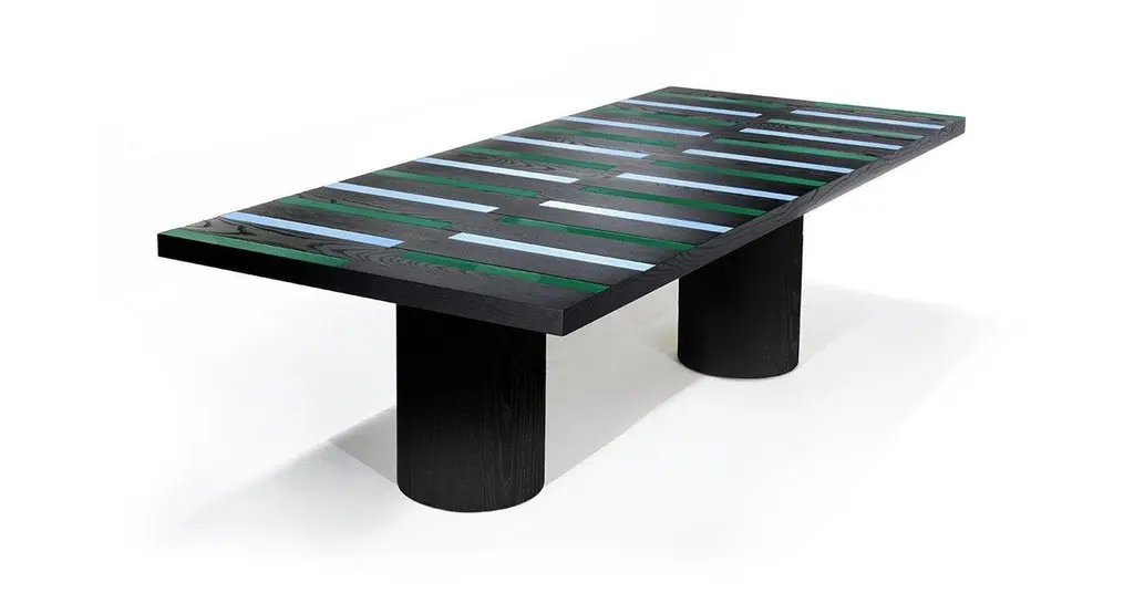 Table . 50 mm thick honeycomb-core wood top, veneered with open-pore lacquered ash in black or amaranth. Back-painted glass inserts inmint and sky colour for the black version or ivory and coral for the amaranth version. Legs in curved plywood, veneered in open-porelacquered ash in black or amaranth.