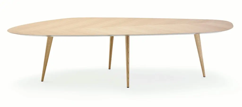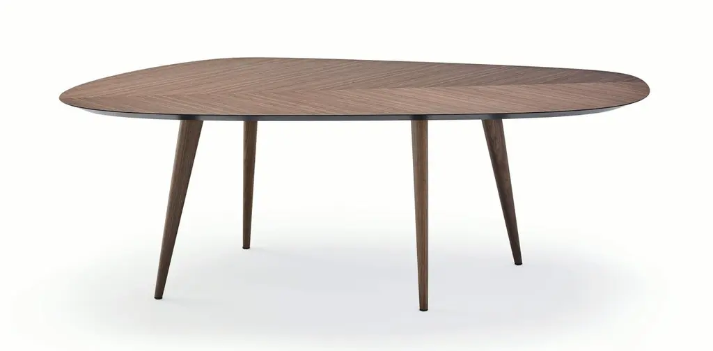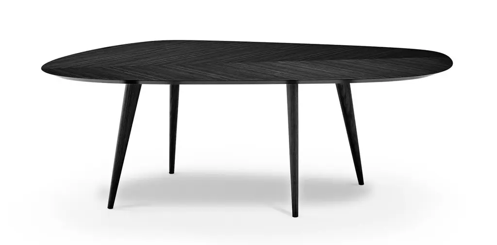 Table. Top available either in natural painted oak veneered wood,with grey painted under-top, or black painted with an open pore,with black painted under-top or in natural painted Canaletto walnut veneered wood, with black painted under-top. Legs are available respectively in natural painted solid oak, or in open pore black painted oak,or in natural painted Canaletto walnut. Black painted aluminium adjustable foot. Smoothly irregular shape“A range of tables featuring tops with smoothly irregular shape. Not just a simple exercise of scale but different models to allow gathering together or a more formal seating, depending on the occasions. The strong and accurate graphic trait similar to the Tweed interweaving, contrast the top outline”.