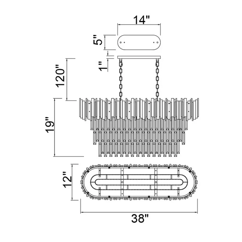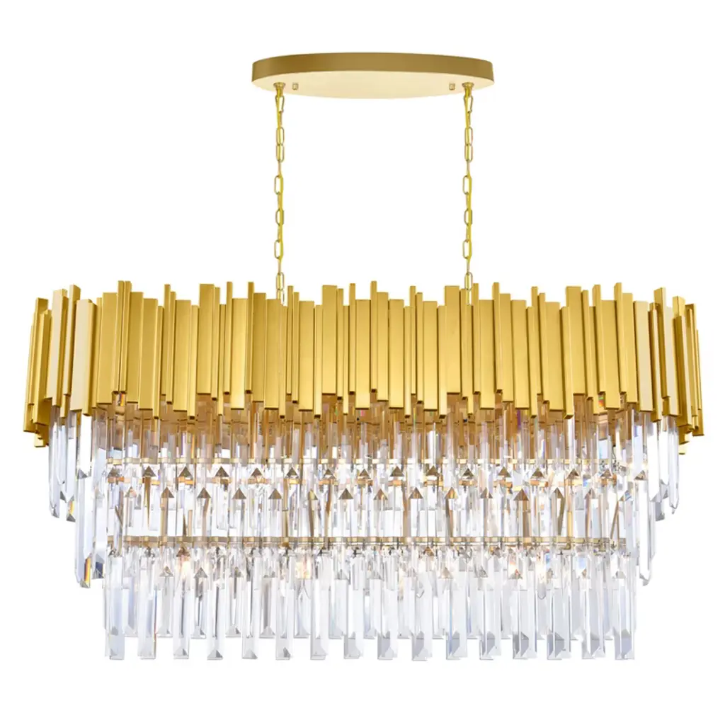 Add an extra layer of character to your dining space with the Deco 9 Light Chandelier. This is a 38 inch long chandelier with a racetrack frame covered with an architectural display of overlapping narrow gold bars. Dripping from the golden frame are two tiers of clear crystal prisms covering nine candelabra-based bulbs. This modern chandelier is sure to make your dining area a special place for making memories