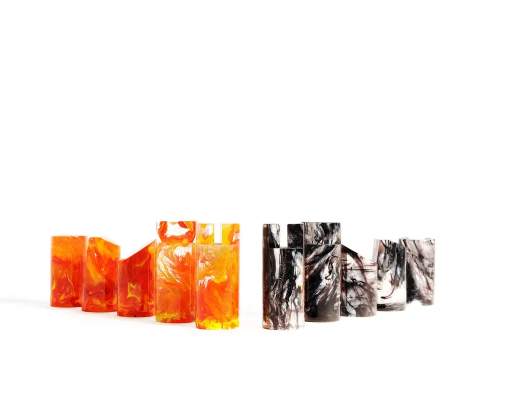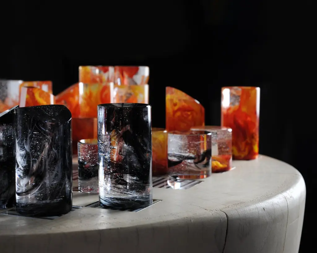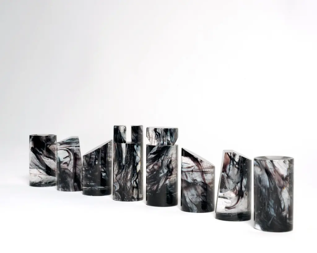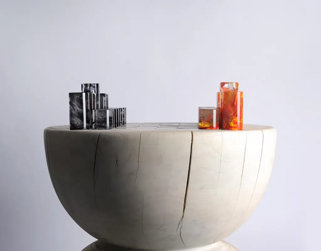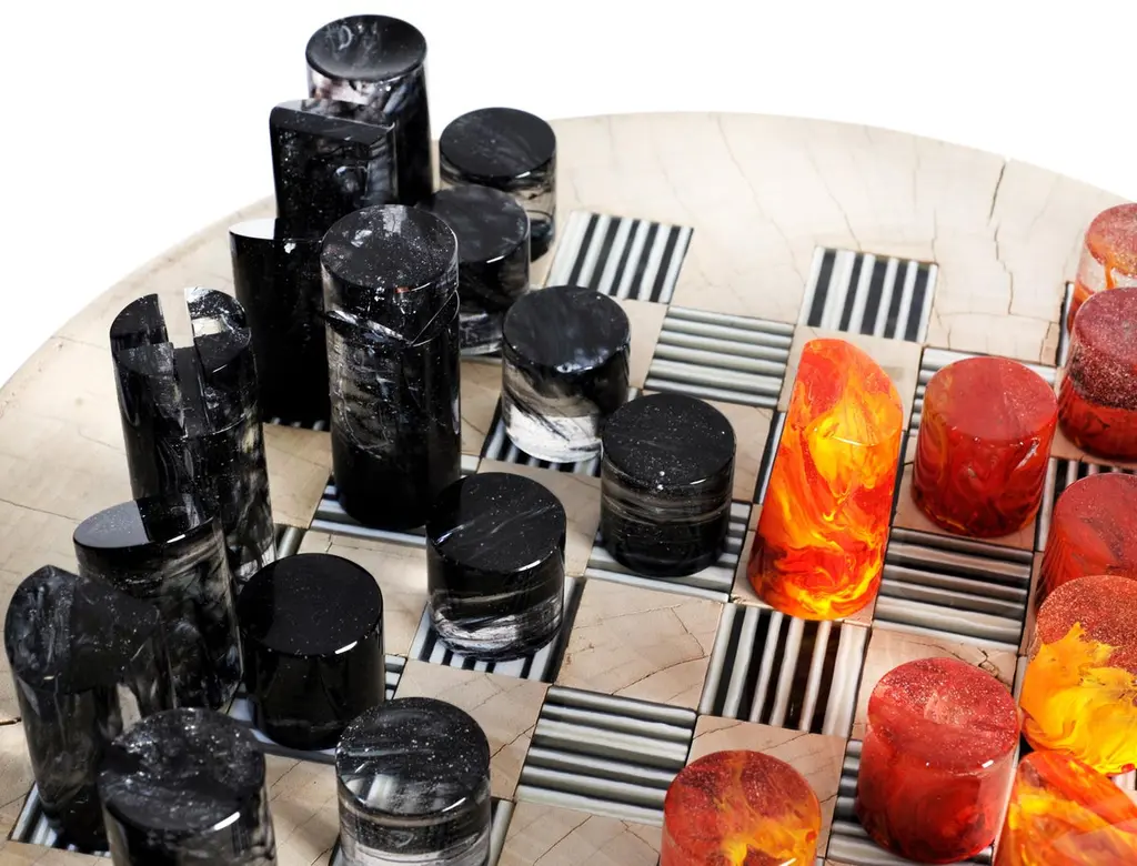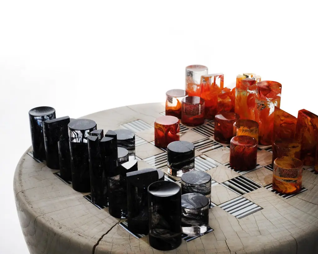 This Board Games edition presents classic games and decorative pieces like Backgammon, Chess and Tic Tac Toe, made out of wood and glass. Since 2000, Orfeo Quagliata offers a remarkable consistency based in design and a fine technical work in glass. He creates custom interior design projects, as well as furniture, jewelry and decorative elements. Orfeo takes his most interesting glass techniques to apply them in the inserts of the table. The "Barcodes" technique is a fine linear design with schemes of different colors that contrast with the wood. For the chess pieces, Orfeo applies the exclusive "Jimmiz Brainz" boiled glass technique, creating a mesmerizing organic ink-in-water effect.