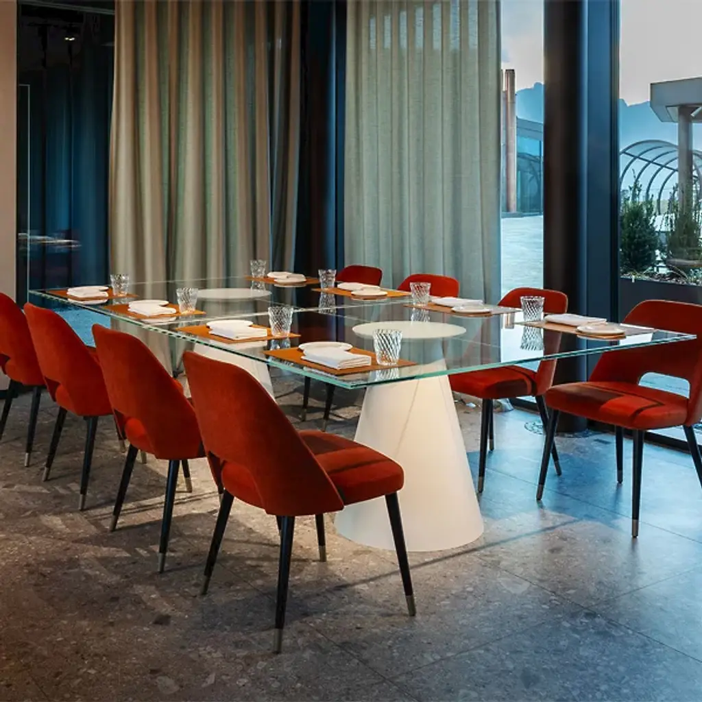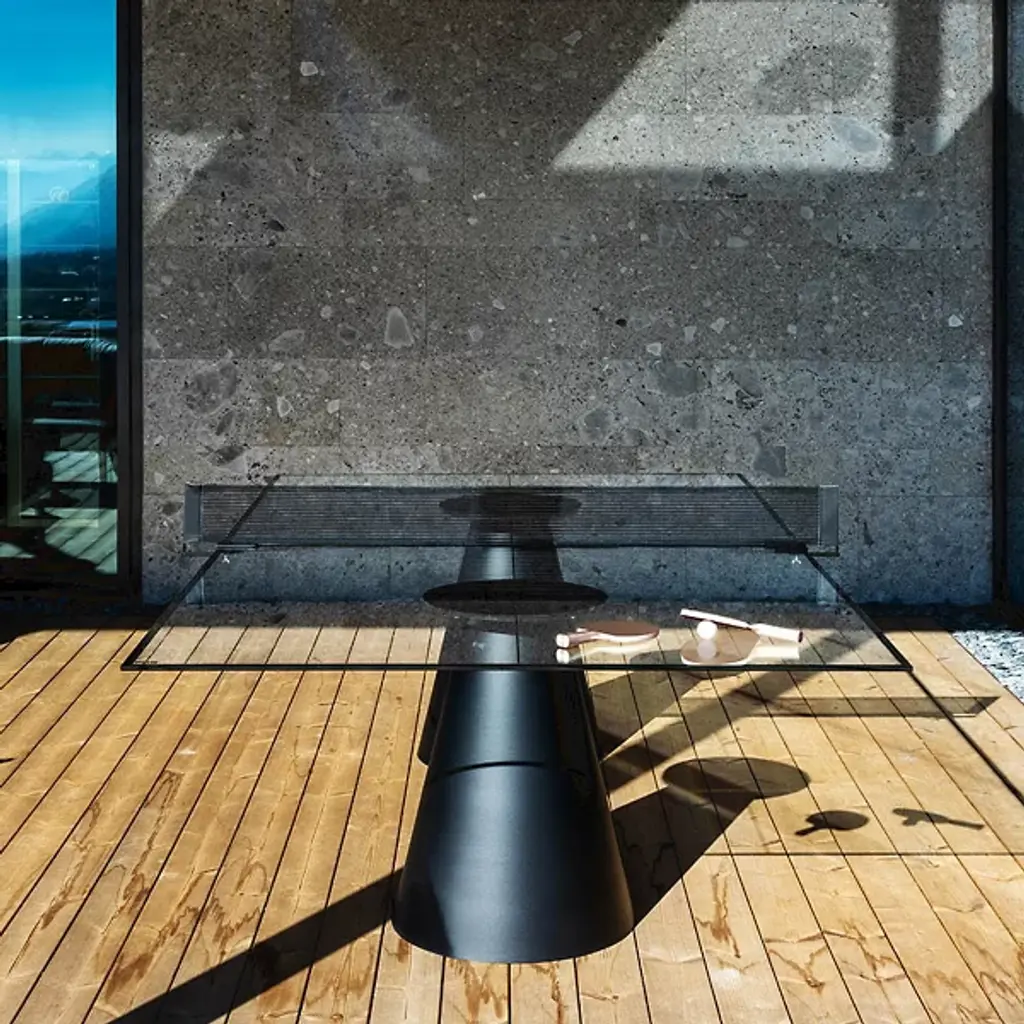 Reshape the concept of table tennis with the starkly simple design and rich material of the Dada Glass Ping Pong Table from Fas Pendezza. Designed by Basaglia + Rota Nodari and made in Italy, it reinterprets the conventional design of table tennis while also being able to split along its centerline to make up two café style tables able to accommodate up to eight seated people. The simple crystal squares contrast well with the conical bases, elevating the transparent glass tops while providing everything needed for a game of ping pong when each half of the table Is united again.