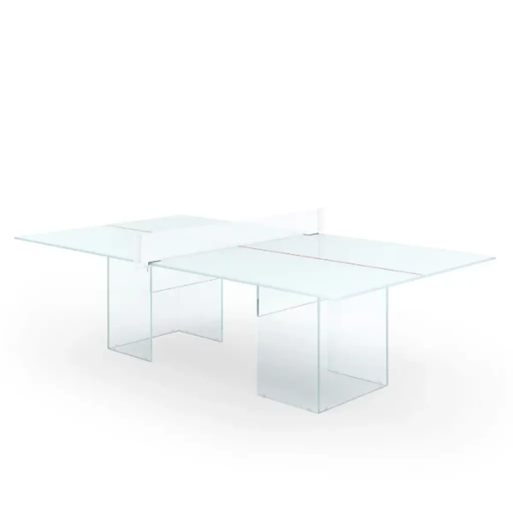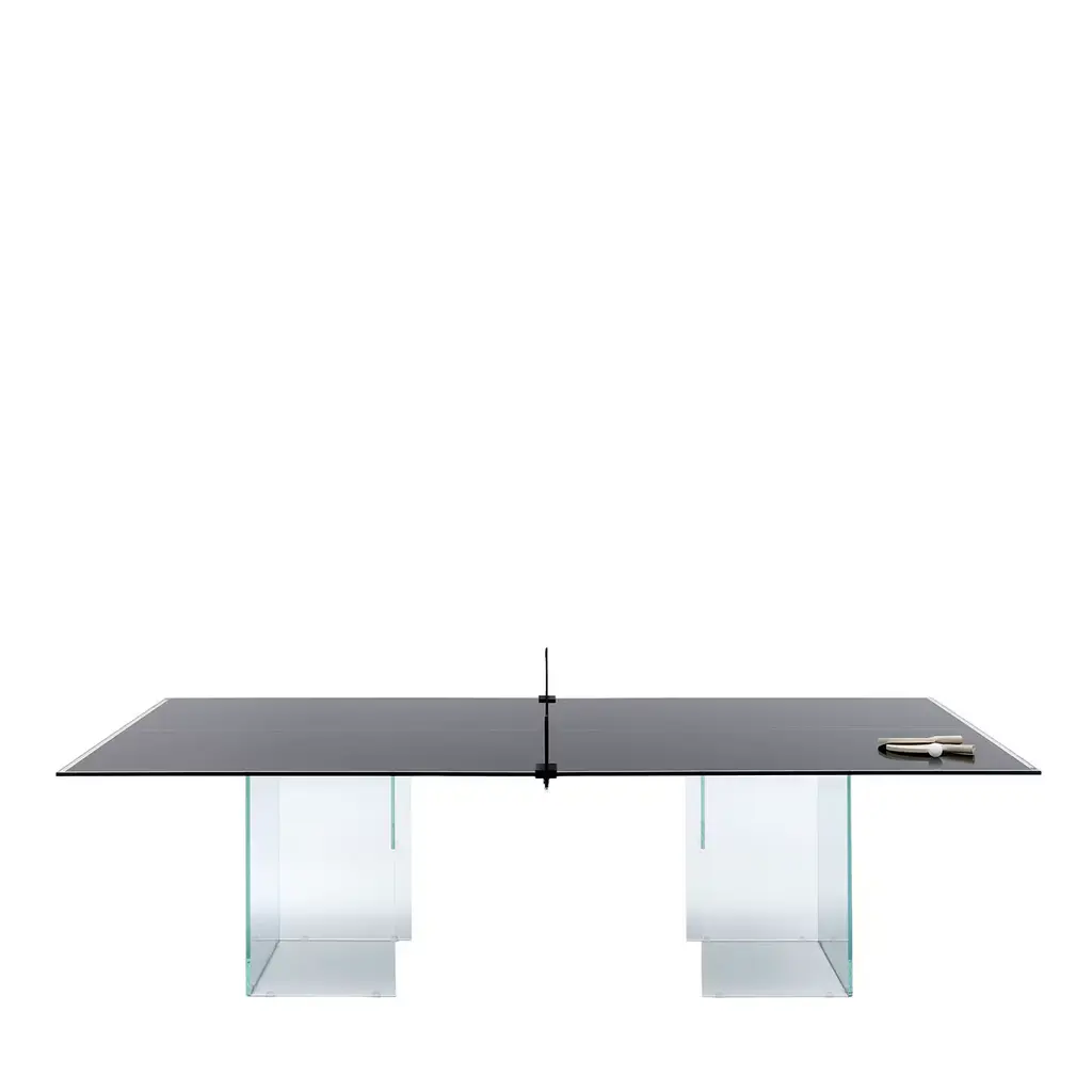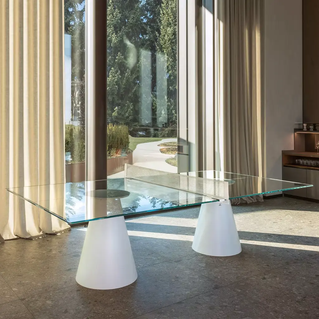 The Dada Glass ping pong table features iconic cone-shaped legs in white. It is characterized by a shiny transparent playing surface and a game lines screen-printed directly into the glass that make the table streamlined and elegant. It can be separated into two beautiful square glass tables. Accessories are included: 2 rackets and 6 balls.