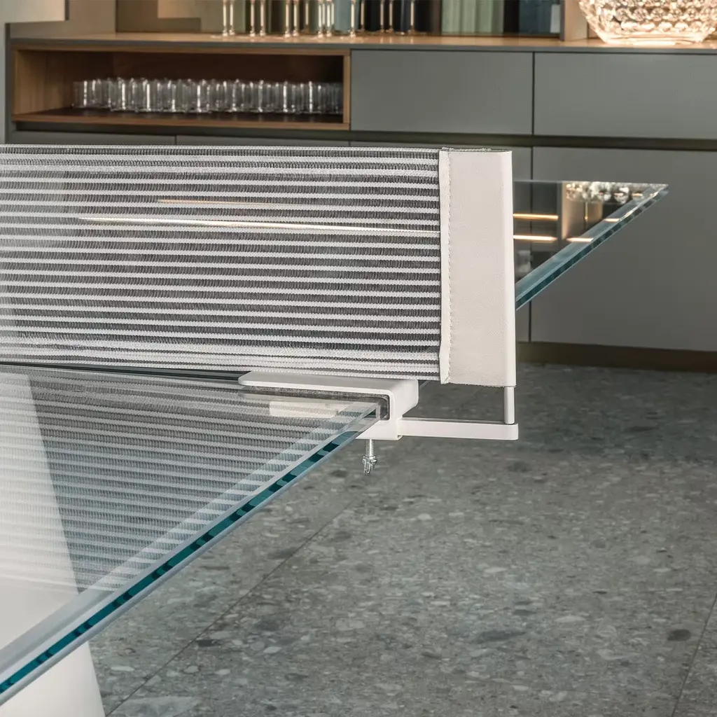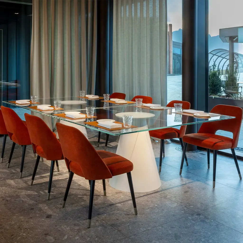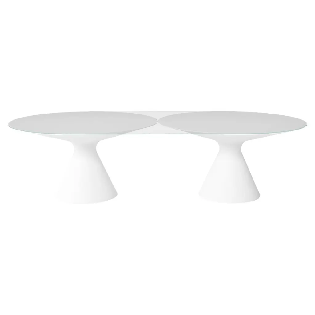 The Dada Glass ping pong table features iconic cone-shaped legs in white. It is characterized by a shiny transparent playing surface and a game lines screen-printed directly into the glass that make the table streamlined and elegant. It can be separated into two beautiful square glass tables. Accessories are included: 2 rackets and 6 balls.