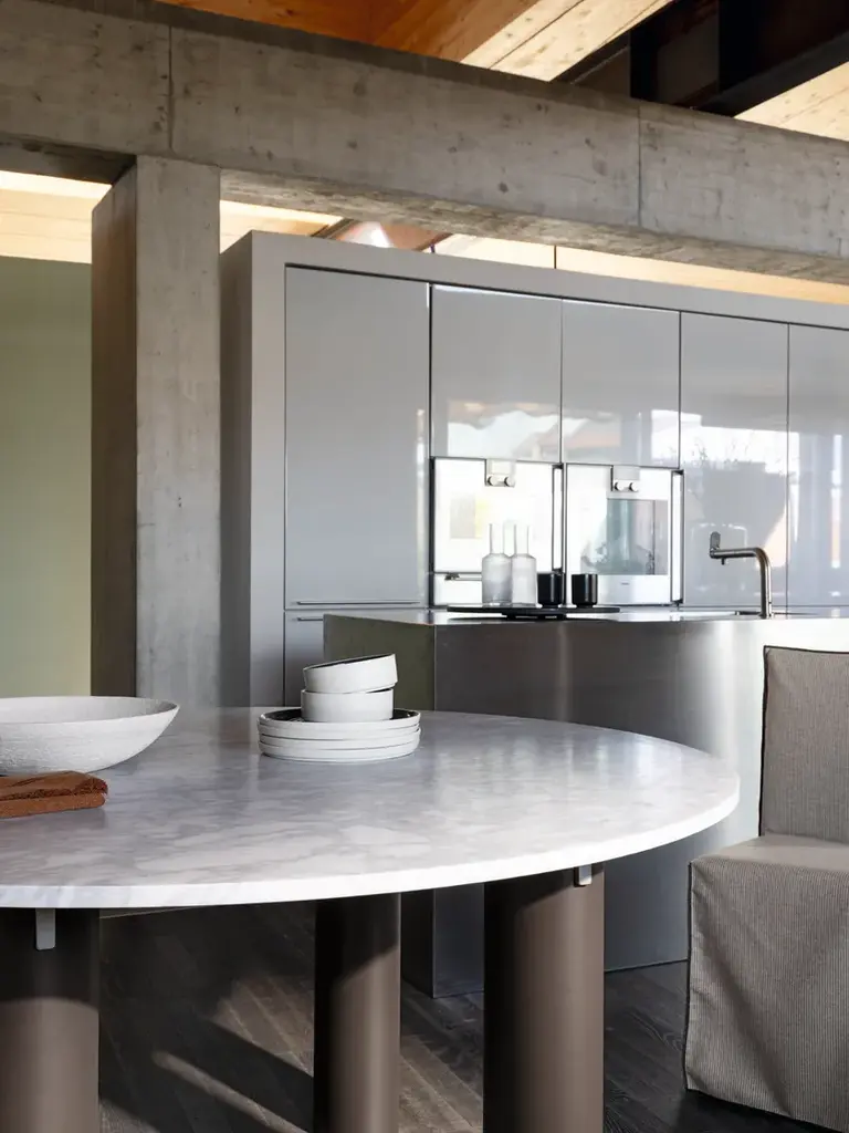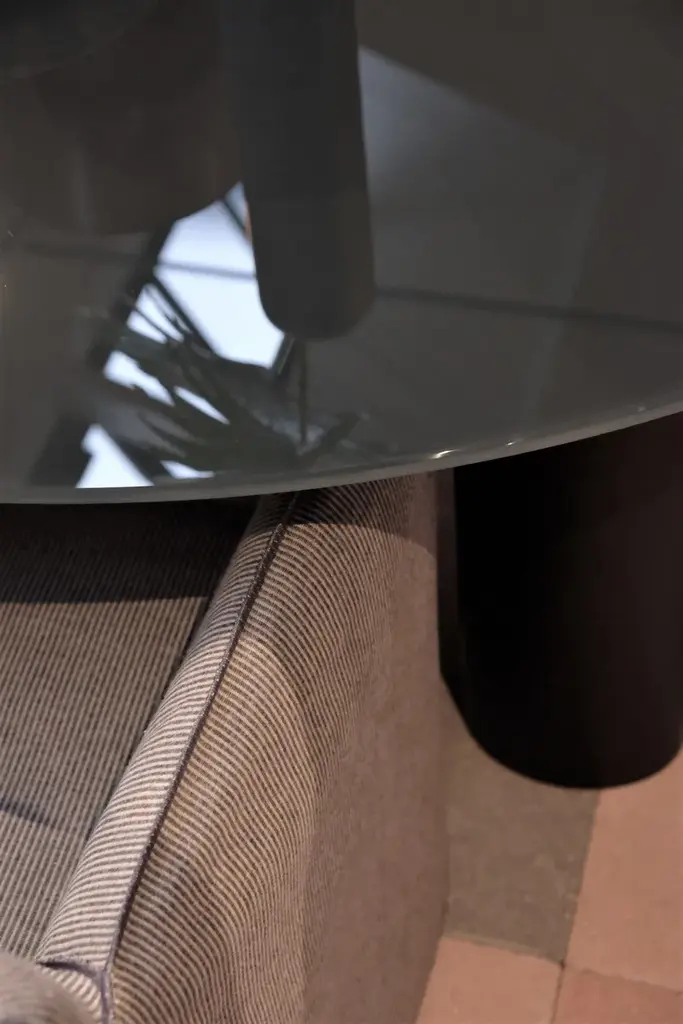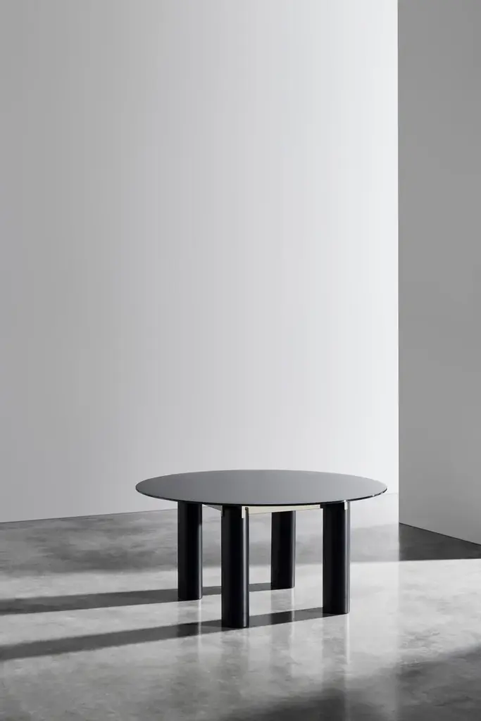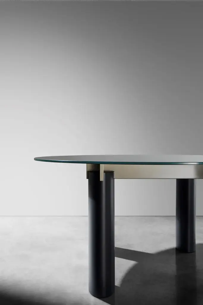 Daen 36 is a round table, fixed top available in the following options: 6 mm porcelain stoneware combined with 6 mm bronze-coloured glass; 12 mm glass painted; white Carrara marble top 20 mm. Lacquered MDF wood feet. Glossy lacquered steel frame.In Japan it is the word for “ellipse”, the Daen dinner table and sideboard take inspiration from two concepts centred on contemporaneity and the contamination among materials. The dinner table inserts itself in spaces inviting conviviality, giving life to atmospheres with an elegant and sophisticated spirit. Pure and geometric volumes exalting the coexistence of different materials while maintaining a formal lightness. The sideboard and the highboard, which pick up the style of the collection, integrate an additional material that is soft to the touch and give personality and uniqueness to the complimenting piece.