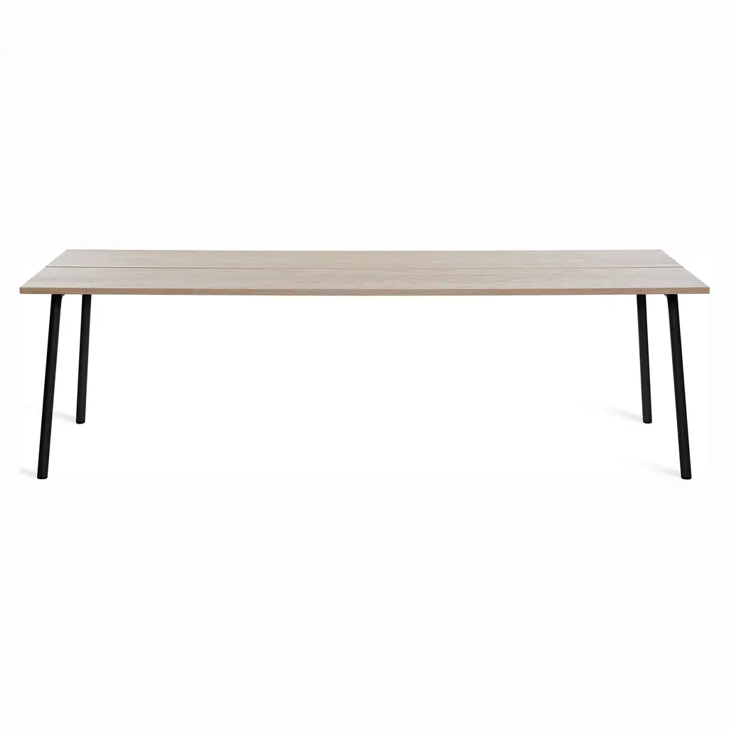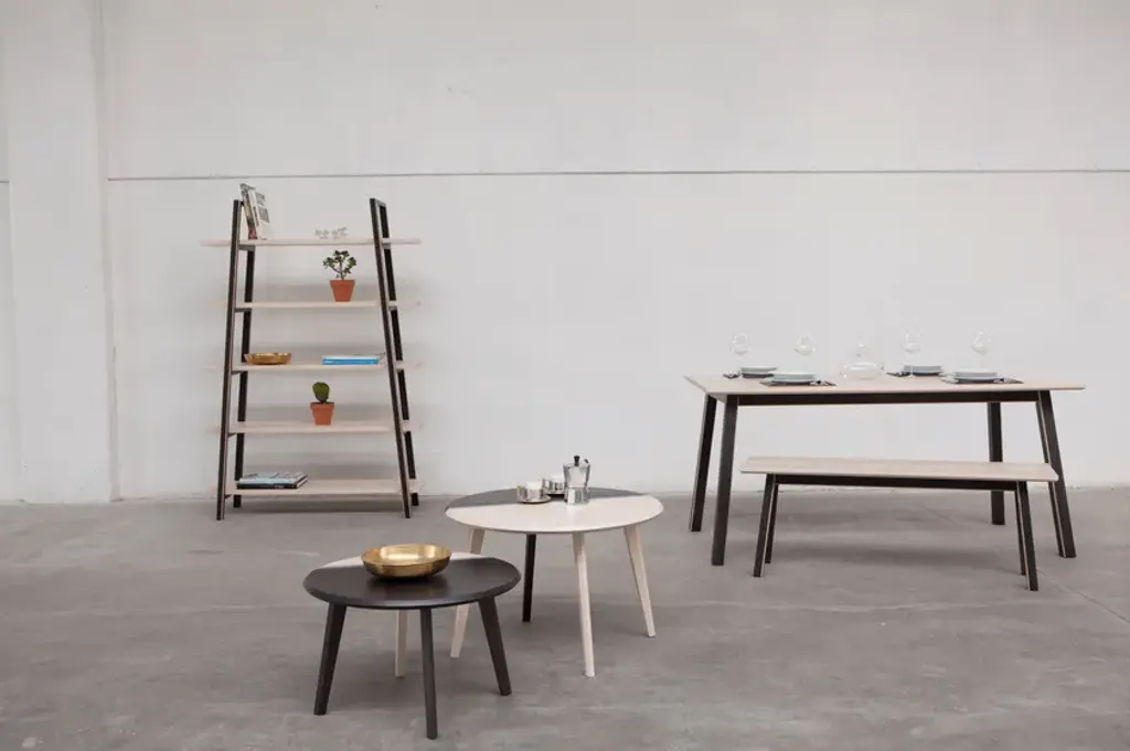 The Dahlia table is made of raw ash wood and is available in two sizes.The product comes disassembled in 1 box and includes all metal fixing.Easy to assemble.Dahlia Collection is inspired by drain pipes and architectural lines the designer saw while living in London.While drain pipes are generally unassuming and uninspiring, Mueller noticed that the drain pipes on certain structures in London were sometimes a contrasting color, giving the structures themselves a sort of outline and added visual interest overall.Mueller replicated this theme with the Dahlia Collection by cutting away the edges of his products (a carpentry term called chamfering).The result is a revealing of untreated ash, which gives each product an outline effect against the stained black frames.