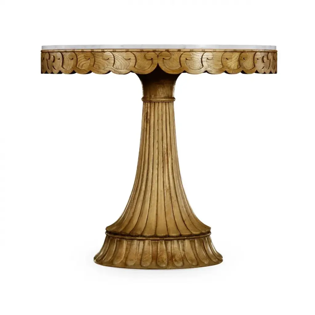 530046-WAO The Dalkeith table is a masterstroke in carving. The hand-carved oak base, fluted, chiseled and sanded, supports the amusing top with curled edges and inset with white Carrara marble. I would love to use this in a foyer or a loggia.