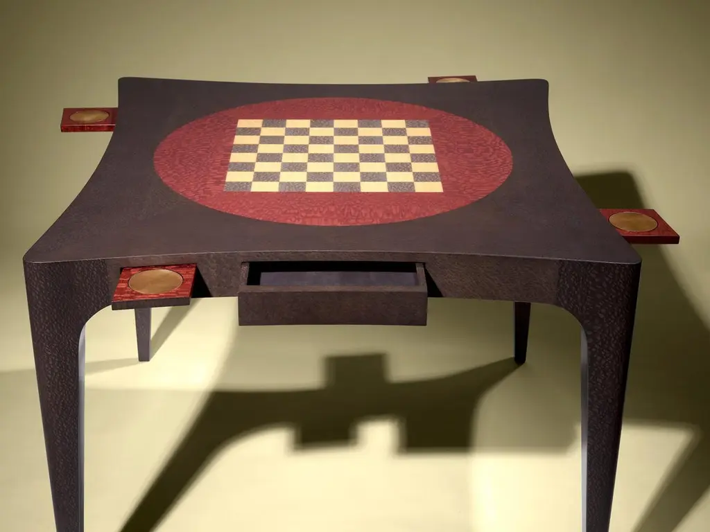 Contemporary card table in laurel wood with inserted marketed chessboard by Luísa Peixoto.Bespoke / CustomizableIdentical shapes with different sizes and finishings.All RAL colors available. (Mate / Half Gloss / Gloss)