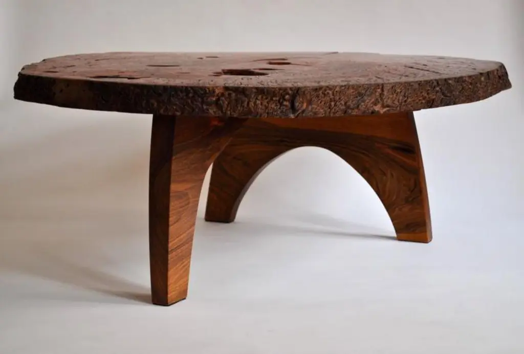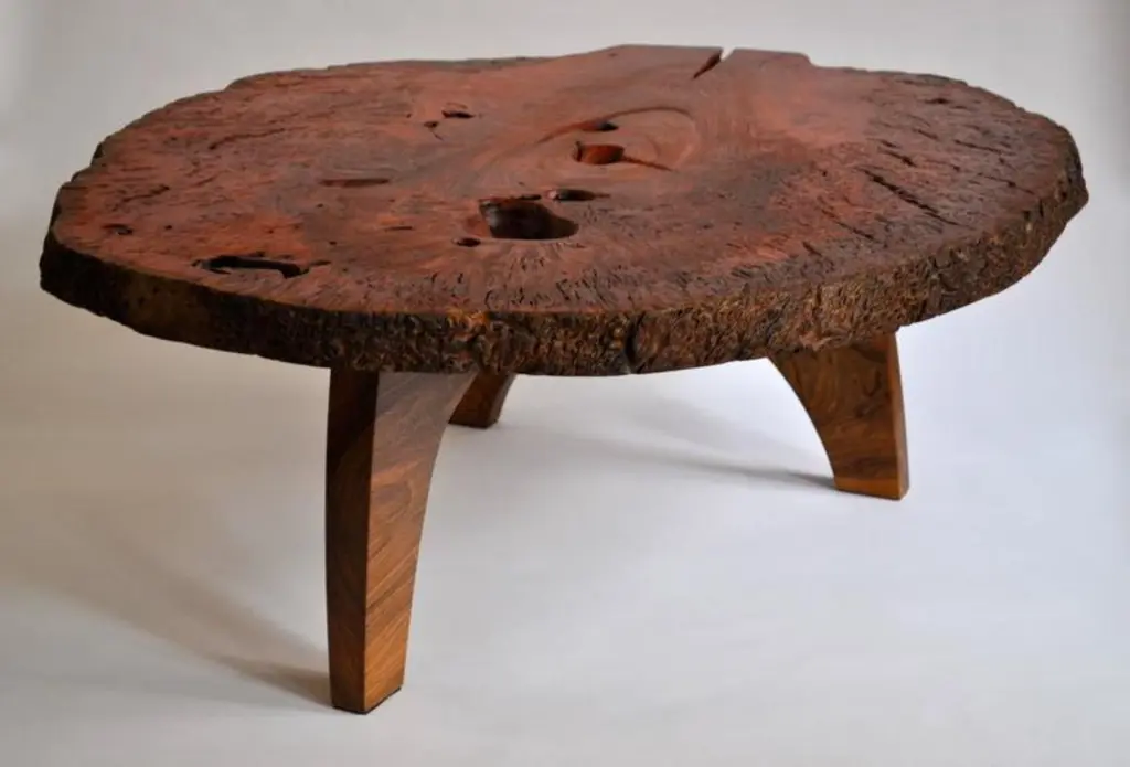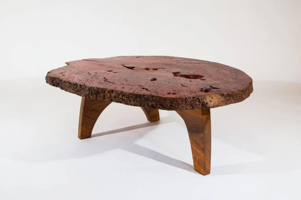 Unique signed table by Jörg PietschmannTable · Jarrah Maser / European walnutMeasures: H 38 x W 118 x D 85 cm tabletop 4.5 cmCavities and structures finely elaborated. Warm dark red color.Leg grains with very clear pattern.In Pietschmann’s sculptures, trees that for centuries were part of a landscape and founded in primordial forces tell stories inscribed in the memory of their fibers.The forms Jörg Pietschmann pares from ancient trees are extensive and astonish with their physical presence, a combination of elegance and primeval nature. Pietschmann’s sculptures are monuments to the trees from which they derive.Being endowed with the ruggedness of primeval matter gives them a veritable vitality: figures that appear to have grown into their sculptural form of their own accord. But Pietschmann’s tangibly present bodies have undergone a considerable degree of metamorphosis.In order to generate these unique tree specimens he examines the tree’s morphology and intrinsic inner map until the courses of its grain, of a curve, knots and cracks concur with his projections. The exploratory process is accompanied by constant modification, giving at the start of each new piece no more than an intimation of the figure that will later emerge. In their completion, Pietschmann’s sculptures once more become universal form.Jörg Pietschmann`s workshop is situated on the countryside close to Hamburg. He works with indigenous timber as oak, lime tree, beech, poplar, olive tree and maple felled by the wind or human hand, together with tropical timber found on his travels.