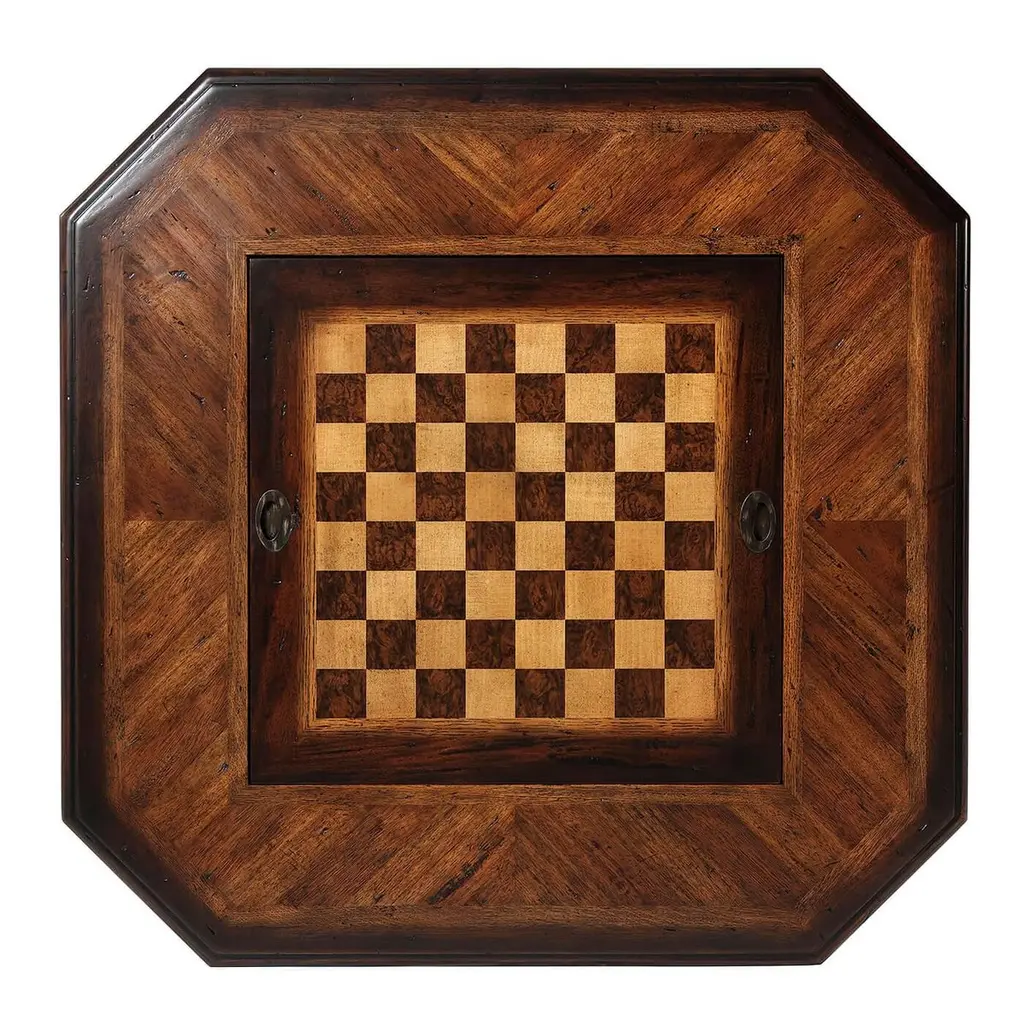 Dark stained rustic game table with a canted corner top, made of mahogany, acacia and oak parquetry, a reversible leather and chess inlaid center, an inlaid Backgammon board in well on a turned column pedestal base. Includes a wooden chess set and backgammon counters.Dimensions: 36" W x 36" D x 30" H