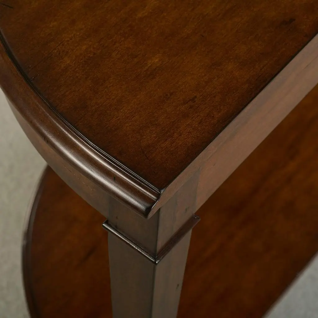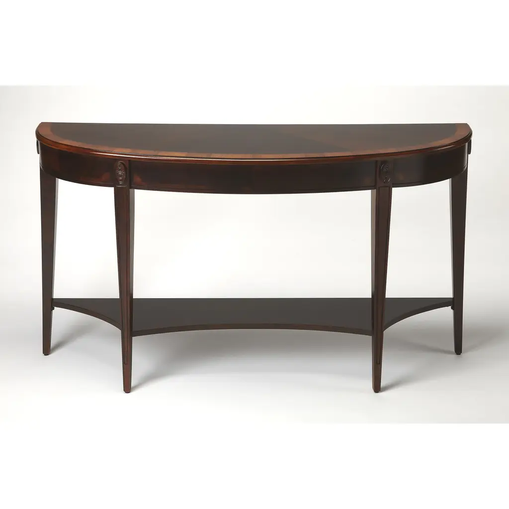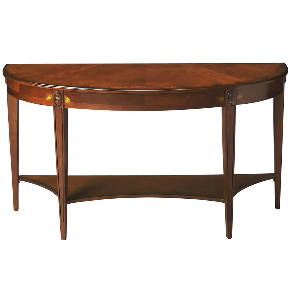 The demi-lune silhouette is accentuated by a molded edge top and apron, showcasing graceful curves with classical inspiration. Square tapered legs support the design while the integrated stretcher shelf offers practical storage and balance to the overall composition.Crafted in a warm, country mahogany stain finish, this console table blends seamlessly with both traditional and transitional interiors. Whether styled with décor accents or used as a display base, its sculpted form and craftsmanship elevate the space with quiet sophistication.Dimensions: 64" W x 18" D x 32.5" H