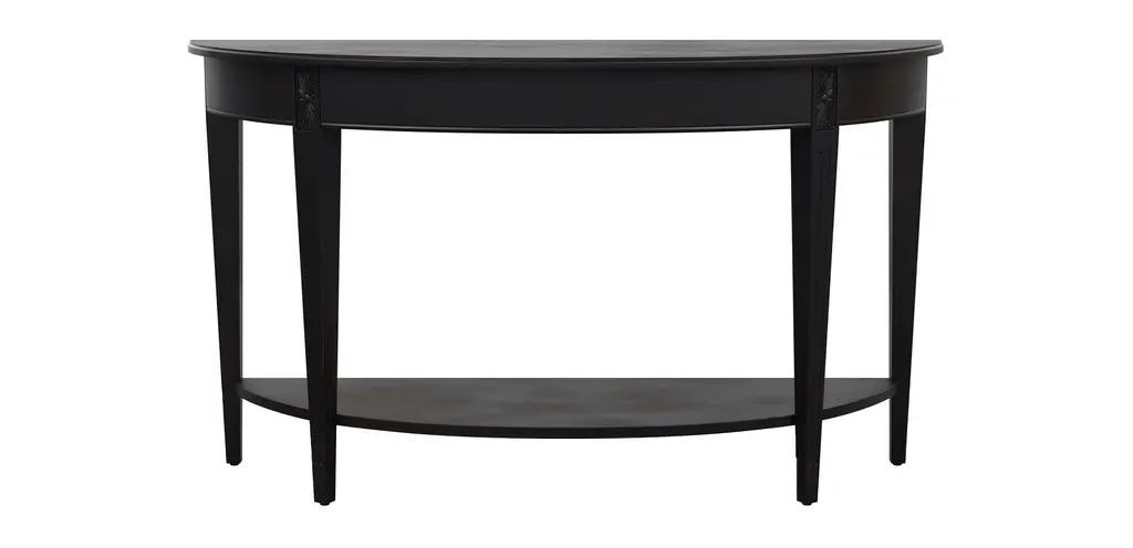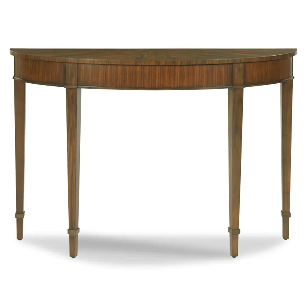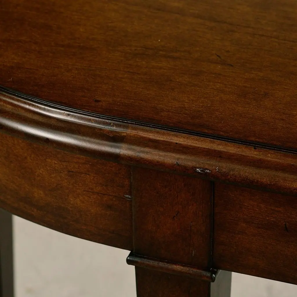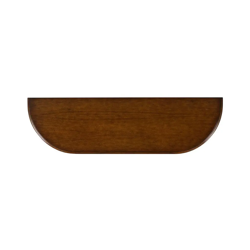 The demi-lune silhouette is accentuated by a molded edge top and apron, showcasing graceful curves with classical inspiration. Square tapered legs support the design while the integrated stretcher shelf offers practical storage and balance to the overall composition.Crafted in a warm, country mahogany stain finish, this console table blends seamlessly with both traditional and transitional interiors. Whether styled with décor accents or used as a display base, its sculpted form and craftsmanship elevate the space with quiet sophistication.Dimensions: 64" W x 18" D x 32.5" H