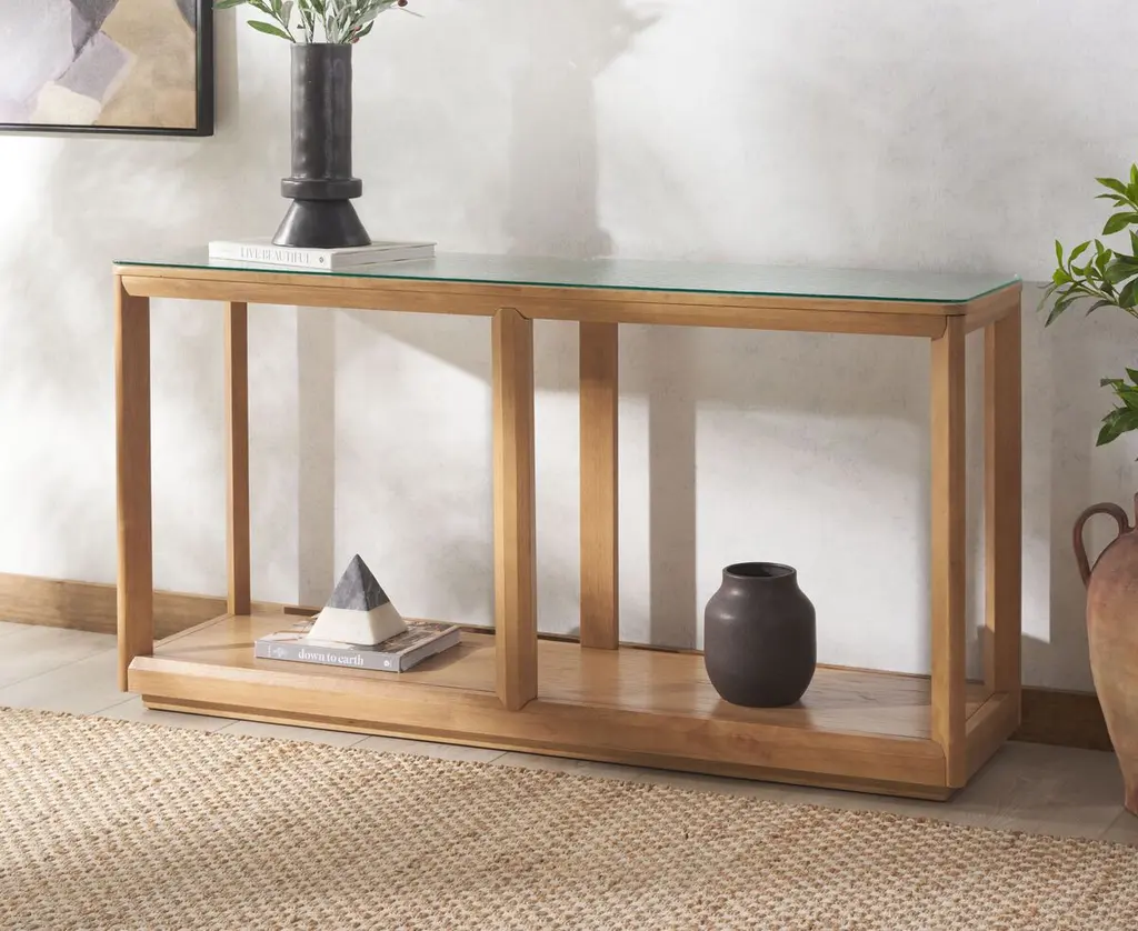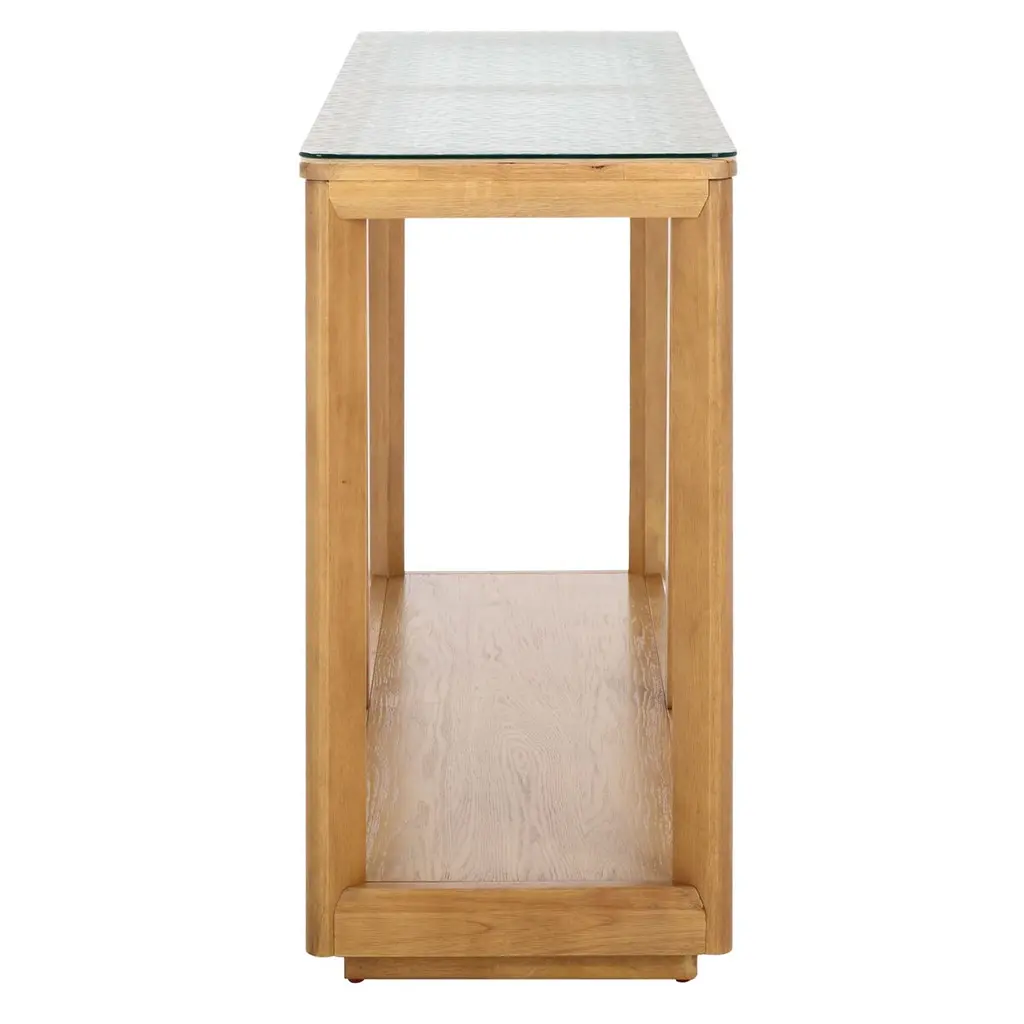 The Darya Glass Top Console Table combines timeless elegance with practical functionality. Crafted from solid rubber wood, its robust construction is complemented by a clear glass tabletop that highlights the wood’s natural grain. Ideal for any décor, this versatile table offers both stylish display space and convenient storage for books, décor, or baskets. A perfect blend of form and function, it adds sophistication and durability to any room.