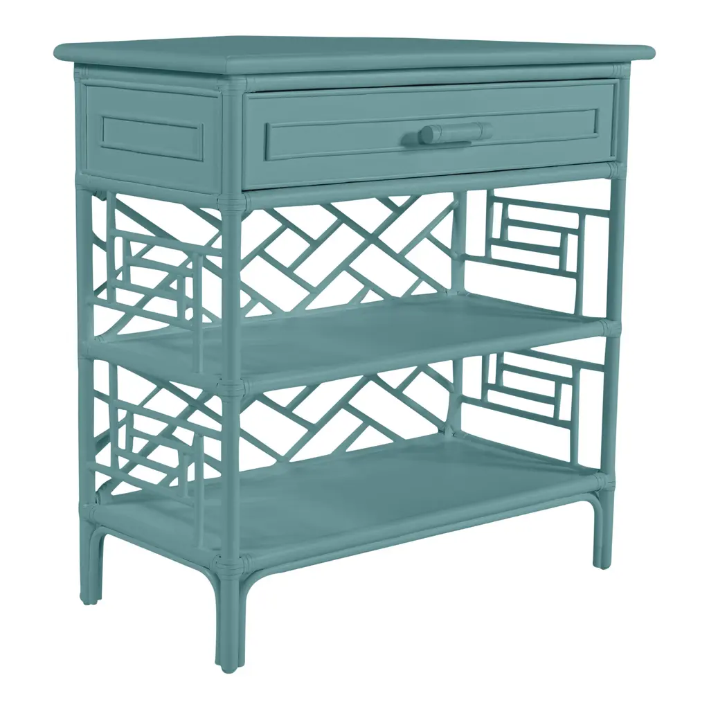 Please note this a made to order propduxt that will take 4-6 weeks to make. Part of our exclusive collection for Chairish, this end table features a Rattan frame with rawhide bindings. The intricate rattan detail is hand applied. The table features one drawer with full extionsion metal drawer glides and two wooden shelves to provide a great deal of storage space. This table has multiple functions and could be used as a bed side table, a dining buffet or perfect for a small entryway. Shelf height 9". Each end table is hand painted to order in the USA. Please allow time for delivery.
