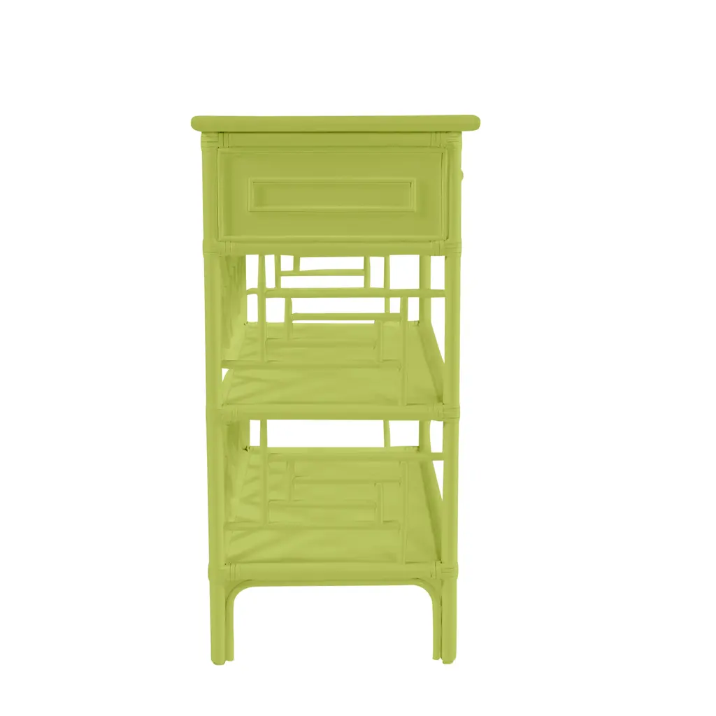 Please note this a made to order propduxt that will take 4-6 weeks to make. Part of our exclusive collection for Chairish, this end table features a Rattan frame with rawhide bindings. The intricate rattan detail is hand applied. The table features one drawer with full extionsion metal drawer glides and two wooden shelves to provide a great deal of storage space. This table has multiple functions and could be used as a bed side table, a dining buffet or perfect for a small entryway. Shelf height 9". Each end table is hand painted to order in the USA. Please allow time for delivery.
