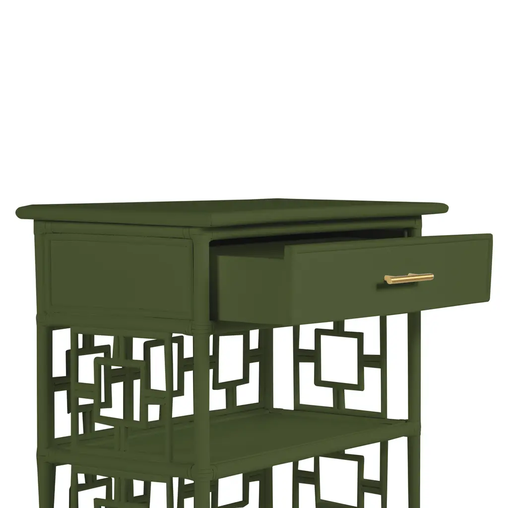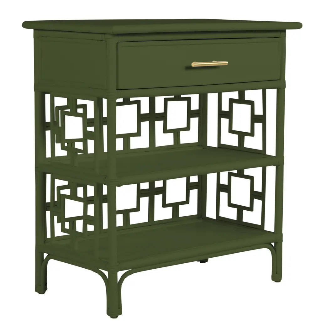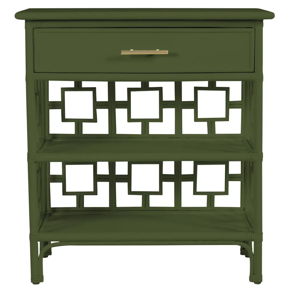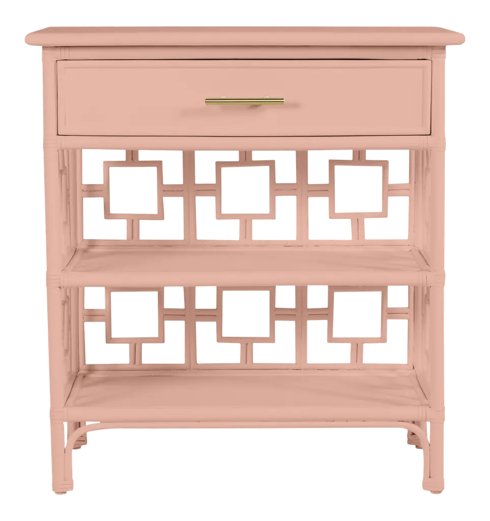 Please note this a made to order propduxt that will take 4-6 weeks to make. Part of our exclusive collection for Chairish, this end table features a Rattan frame with rawhide bindings. The intricate rattan detail is hand applied. The table features one drawer with full extionsion metal drawer glides and two wooden shelves to provide a great deal of storage space. This table has multiple functions and could be used as a bed side table, a dining buffet or perfect for a small entryway. Each end table is hand painted to order in the USA. Please allow time for delivery.