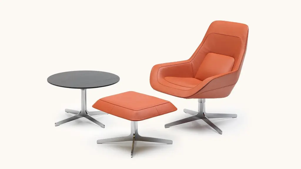 Sit the way you would sit in a racing car. Minimalist, streamlined lan guage of design for maximum seating comfort: sitting in the lounge chair is like sitting in a quick, sleek speedster. The planeness with the circum ferential edges gives the DS-144 armchair an unusually clear, direct and tidy look. The four-star base echoes the vocabulary of forms and logically completes it.“Fluffy,” as the DS-144 lounge chair is lovingly named by designer Werner Aisslinger, stands for a hard shell with a surprisingly soft core. The basic idea that inspired the designer was the play of contrasts. In contrast to the streamlined linear structure of the outer shell with its varied ensemble in the form of a soft padding, he wanted to provide an artistic and artisanal representation of the multifaceted appearance of the seat. Aisslinger devised the structure typical for DS-144: with its dual shell construction, the lounge chair became a constructive, high-tech product that sensitively embraces the person seated the way a racing car would guaranteeing the ultimate character of relaxation. Additional Information:Material: Black OakDimensions: Ø 65 x 40 H cmAvailable in other base finish options: Black.