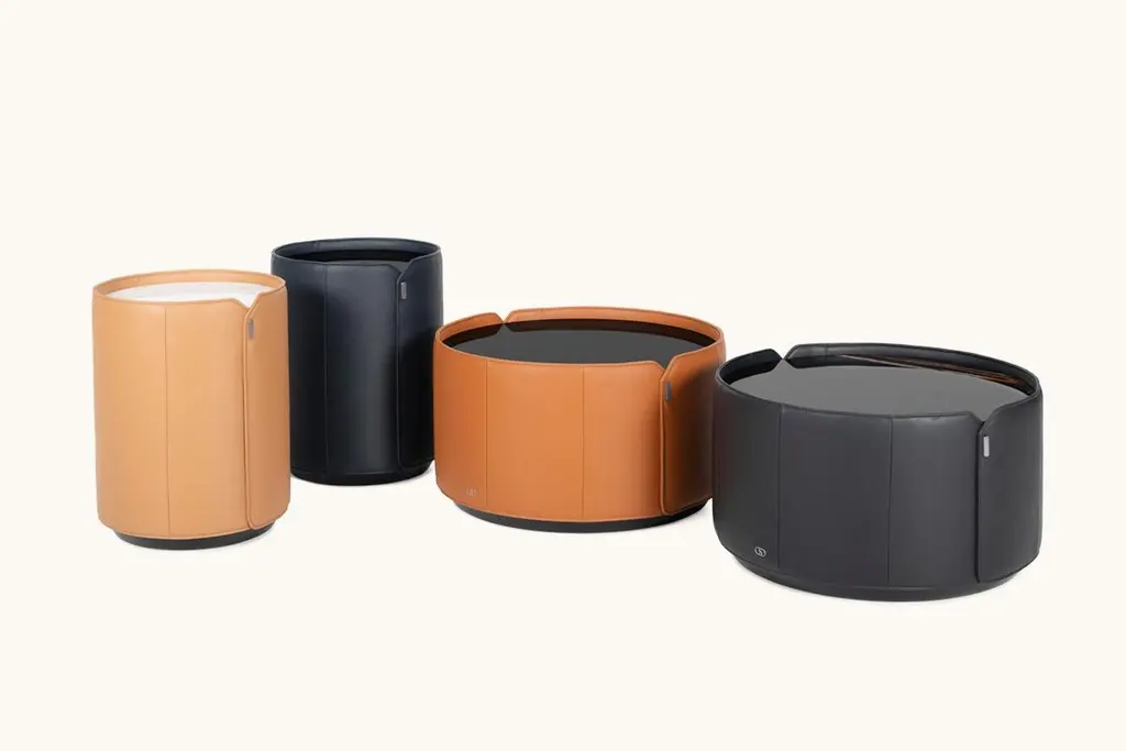 The modern table construction is wrapped all around in high-quality, stretchable and adaptable leather. The stylishly selected tabletop completes this exclusivity: made of glass or marble, it is elegantly embedded in the construction and makes the object an unmistakable masterpiece.Be it Pierre Cardin, Coco Chanel, Giorgio Armani or Jil Sander: the creative minds of the fashion world have always inspired interior designers. A button, as the fashion designers have demonstrated, serves not just for everyday buttoning; at the same time, it is always a piece of jewelry, made of glass, precious stones, metal or wood. The cufflink animated Stuttgartbased Industrial designer Simon Busse when he created his table models. The vertical circular cylinders of two different heights are encased all around in high-quality leather – together with a fixing button as a small homage to the king of shirt buttons. The individual patina of the raw material really strengthens the soul of this item of furniture – because it combines the uniqueness of leather and manufacture as a one-off item.Additional Information:Material: Nougat LeatherType: Nappa leather, lightly pigmentedThickness: 1.2 to 1.4 mmCharacteristics: Meticulous processing preserves the natural quality – with a characteristic pattern of creases, grain and pores. After tanning, it is dyed with a special finish to maintain the natural aura while also offering improved protection. It undergoes visible ageing, lending it an endearing patina.Dimensions: 41 Ø x 55 H cmSeat height 55 cm.