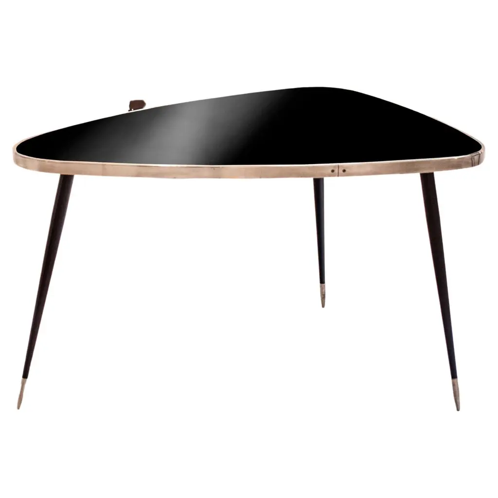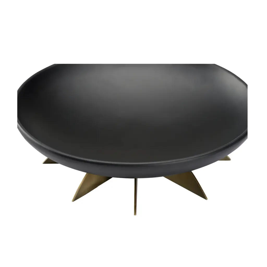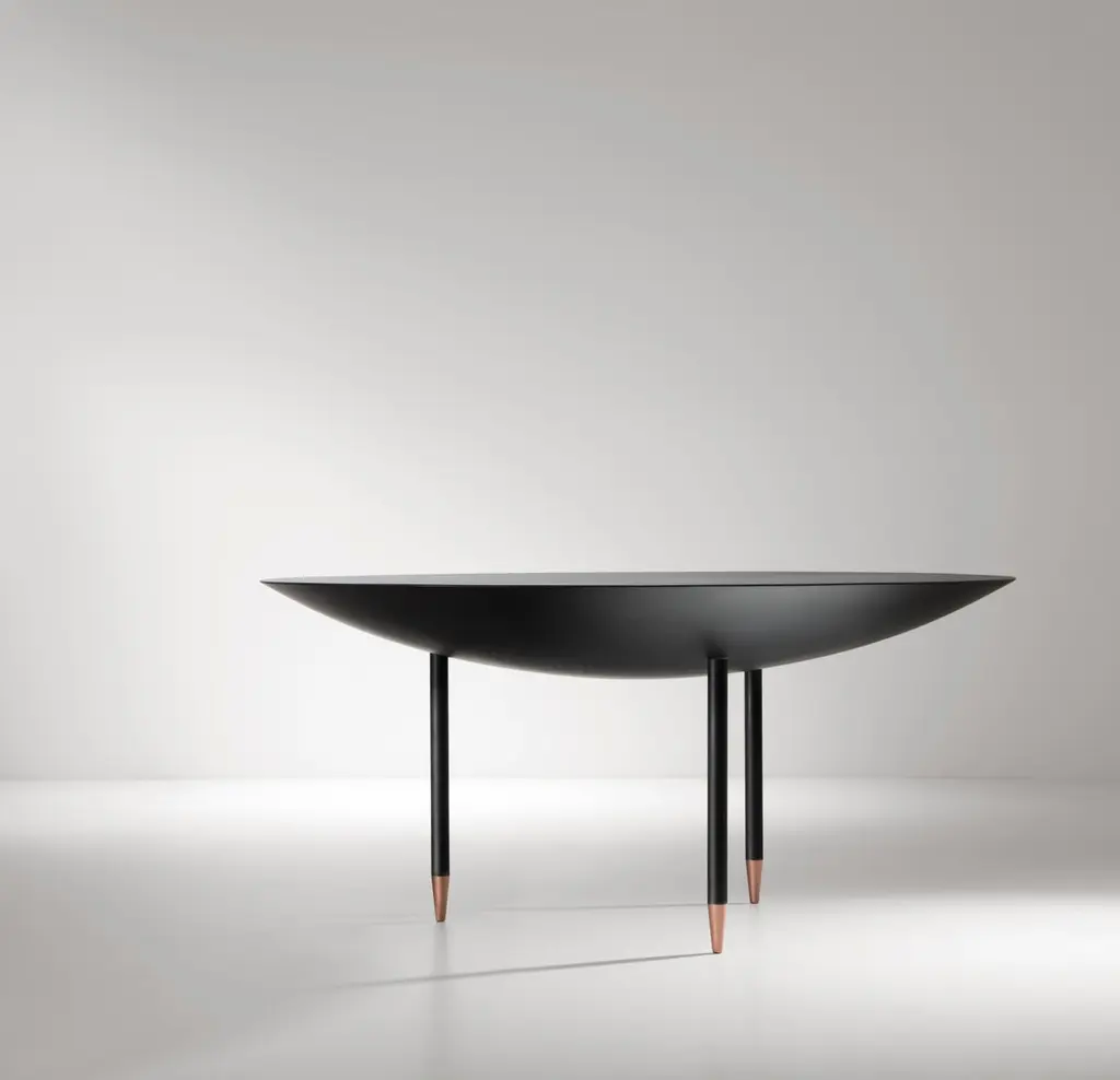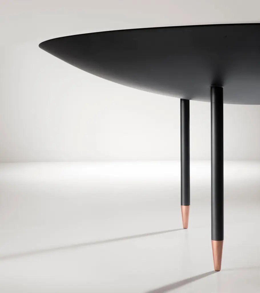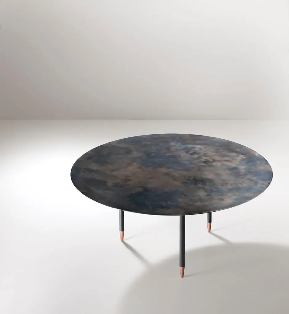 A table that interprets the round, spacious form of a brazier, which it echoes in its size and volume. A symbol of sharing and communion that references the ritual of conviviality and spending time together. The top, in generous proportions, and the lower ‘lens’ fuse into a single piece, into which three legs are inserted. The personality of this sculpture-table arrives via the iridescent finish of the top, the memory of always-glowing embers, and the luminosity of the copper feet upon which the legs rest, lightening our perception of the whole.Additional Information: Material: Stainless steel top with iron structure and brushed copper feetFinish: DeOpale M0 AISI 304 stainless steel top, iron structure L1 matt black lacquered finish, brushed copper feetDimensions: Ø 137 x H. 75 cmAvailable in other color option: DeOpale M0 AISI 304 stainless steel top, iron structure L1 matt black lacquered finish, brushed brass feetAvailable in other size option: Ø 160 x H. 75 cm