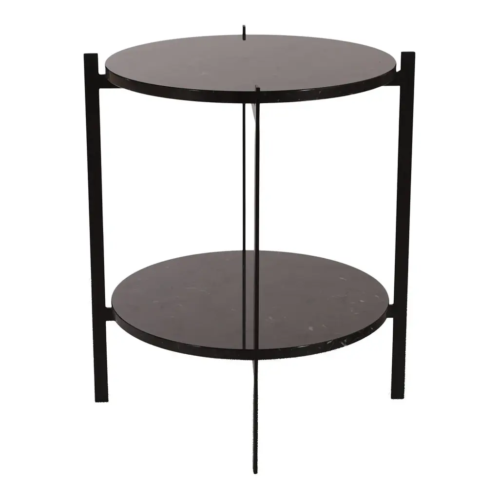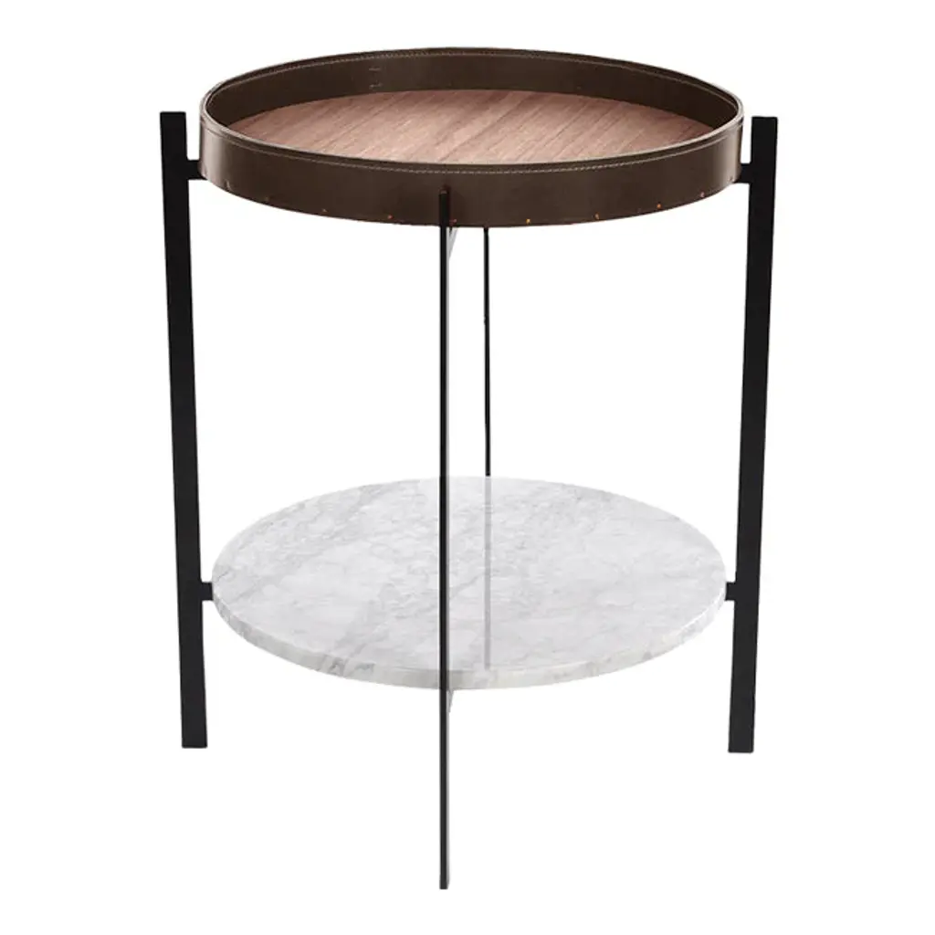 Frame made in powder coated steel or brass (steel with brass surface). Marble tops are to be screwed on to the metal frame. Glass tops can be clicked onto the frame. Leather tables will be delivered assembled. Table tops in Carrara Marble, Black Marquina, Green Indio, or Brown Emperador will exhibit natural variations in terms of colour, drawings and patterns characteristic for each type of marble. As for Carrara Marble, small cracks can sometimes be found on the polished surface. This phenomenon known as “taroli" is a natural characteristic of the stone, which cannot be eliminated completely. Leather is handmade by skilled craftsmen using high-quality 100 % vegetable tanned aniline leather with a general thickness of 3 mm or more. Natural imperfections on leather surface must be accepted. With time, light and use, the leather will gain depth and lustre as it ages. Due to the highly artisan process used and variation in the natural raw material, leather can wary quite significantly in colour between production batches.