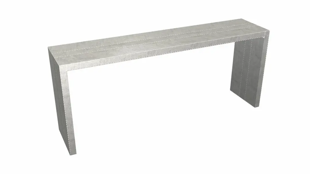 Alison Spear designed this elegant and minimal table for Stephanie Odegard during their trip together to Rajasthan, India. The craftsmen create patterns using different types of hammerings in the metal sheets clad over teak-wood structure.Crafted with utmost care and attention to detail, these Rectangular Console Tables are made to order and are available in twelve metal clad finishes, ensuring that you can choose the perfect one to match your individual style and taste. The use of high-quality materials and expert craftsmanship ensure that each Art Deco Rectangular Console Table is not only beautiful but also a true piece of art.The Straight legs and side arms of this Art Deco Rectangular Console Table are hand carved from solid pieces of teak. Pattern makers trace and cut complex forms that will cover the chair in a skin of copper, white bronze, brass or antiqued white bronze The metal finishes will tarnish over time. Regular non-abrasive household metal polishes can be used to restore the original luster.Overall, if you're looking for a piece of furniture that combines luxury, comfort, and style, then the Art Deco Rectangular Console Table is an excellent choice. With its distinctive curved profile and multiple finish options, this Chair set is sure to elevate the look of any room it is placed in, and be a beloved addition to your home for years to come.The images shown in this listing are shot in different lighting conditions and/or are 3D illustrations. We encourage our customers to please request a sample or a full sample set of 12 finishes so that they can experience the finish first hand. deco Coffee and Cocktail Console Tables in White Bronze Fine Hammered by Alison SpearSize- 72"x 16"x 30"HMaterials - White Bronze, Metal sheet, Teak, Wood, MetalTechniques: Hand-Crafted, Hand-Carved, Metal Work, Wood Work, Metal Wrapping, PolishedPlease note that moisture in air, sudden change in temperature and natural movement of wood over time causes the metal to wrinkle or bubble up. We use well seasoned, reclaimed teak and high quality marine grade MDF (wherever technically possible) to avoid and delay the mentioned changes. However a perfect stability of metal cannot be guaranteed. Please note that our smooth finish metal clad pieces will have some unavoidable tool marks. This is proof that everything is done by hand. The smooth finish will not come out like a machine made perfect surface and the master artisan will do their best to make it look as good/clean/stable/perfect as he possibly can.The antique white bronze finish is hand done by using an acidic chemical over the white bronze finish to recreate a natural patination. Like with the natural patination of silver, copper, or brass, the final result and color uniformity of the patina cannot be guaranteed. The goal of this finish is to achieve rainbow-like shades with dull, shiny, cloudy, and streaky patches to give an illusion of antiquing. Please note:None of our metal clad pieces are treated with a protective “finish” thus enabling the items to age naturally over time. We will of course polish them well before we pack them. a) Copper oxidizes faster than the other metals. In six to twelve months it will most likely lose its shine and will gradually turn to different shades of brown and/or green/blue. This aging process and its effect is referred to as verdigris. After a year the piece should not change much more. Copper does not rust, but does require periodic cleaning in order to retain its original shine if that the preferred option. ('BRASSO' or any known copper polish can be used to polish copper).b) Brass retains its shine for far longer than others, but will tarnish if not cleaned on occasion. ('BRASSO' is made to polish brass).c) White bronze, has the least tendency to show age or tarnish. If kept in a controlled climate, this metal will hold its shine for years. It can be cleaned with a cleanser and polished with a cloth. d) The antiqued white bronze finish will react with the natural elements the fastest in the beginning but it too will stop reacting and will settle down in a stable state like copper after 6-12 months. Since it is already antiqued and looked like it is tarnished, as described in an earlier message, this fast reaction will not change the over all look. In that way this surface is most forgiving. The images shown in this listing are shot in different lighting conditions and/or are 3D illustrations. We encourage our customers to please request a sample or a full sample set of 12 finishes so that they can experience the finish first hand.