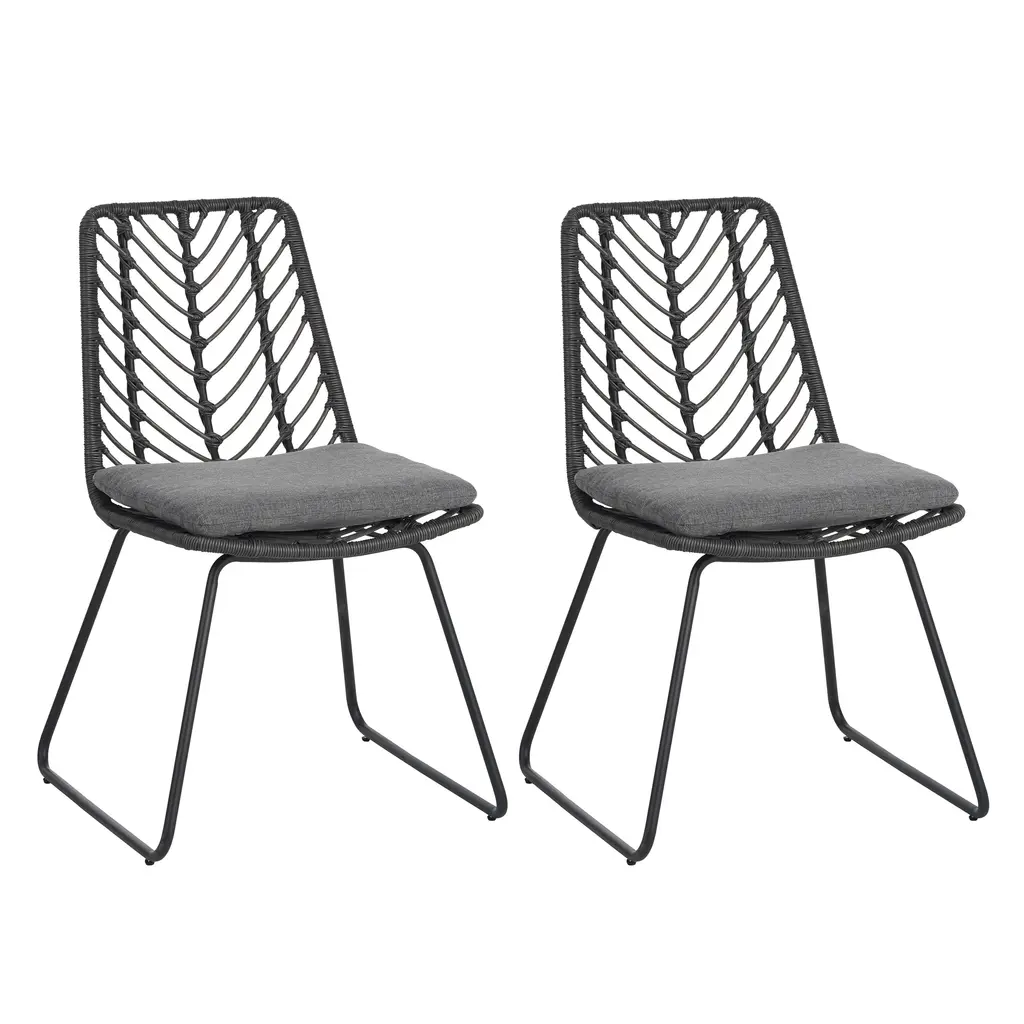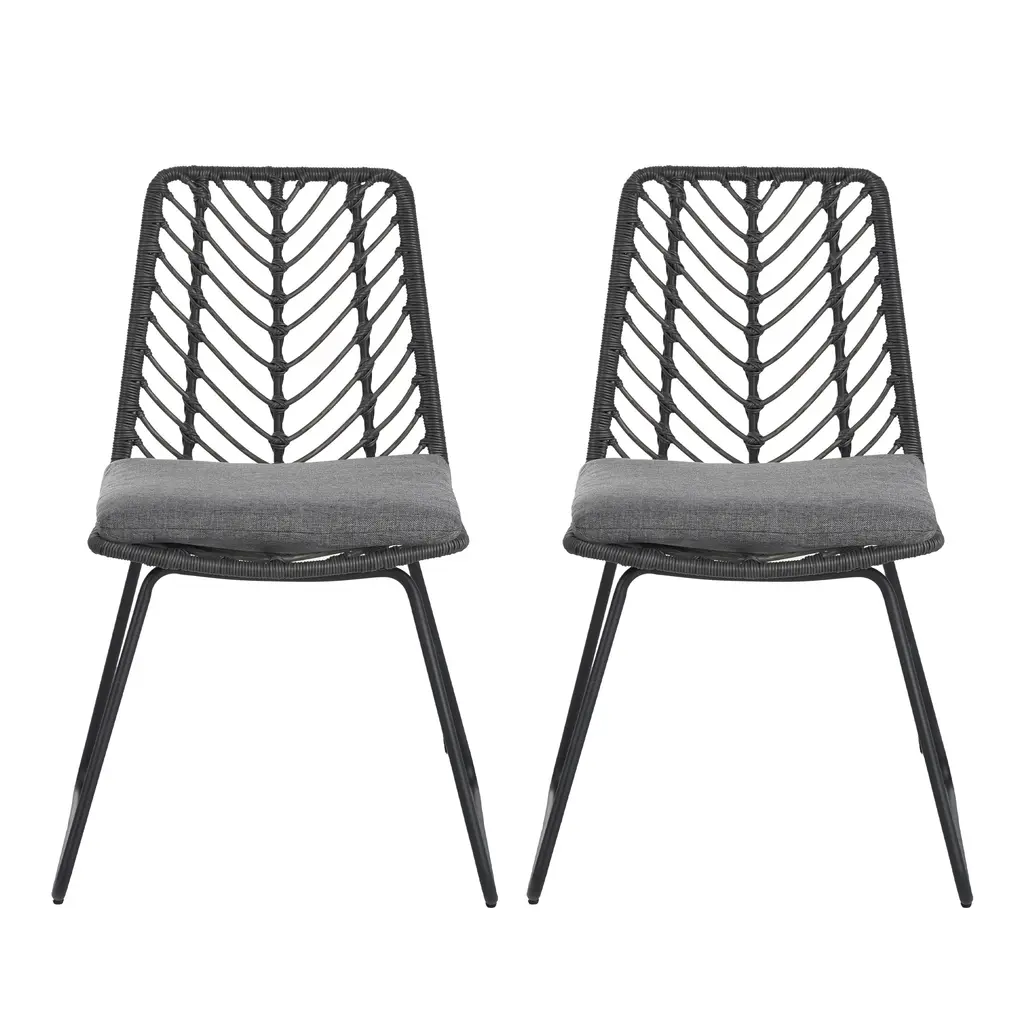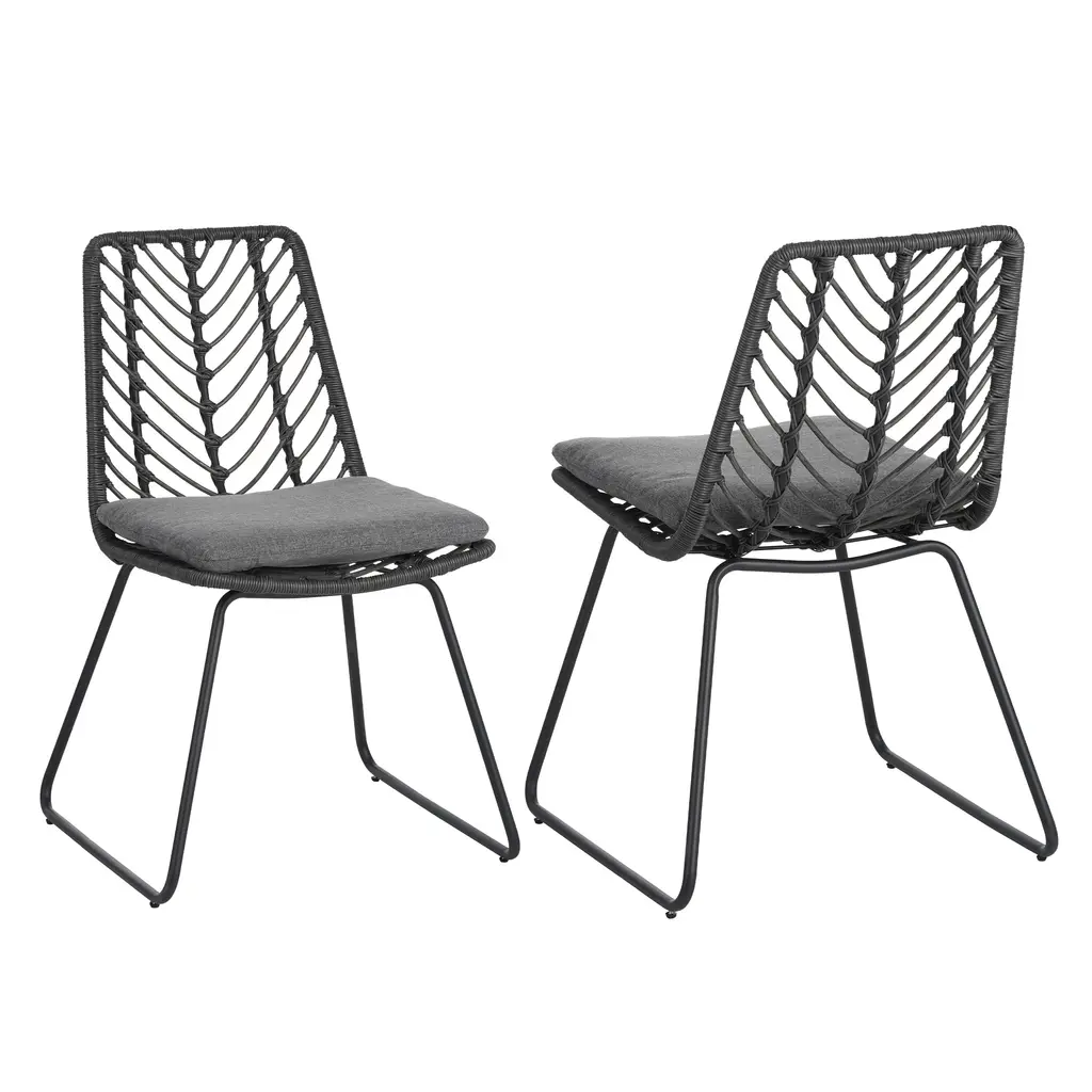 TRANSITIONAL: The transitional style of this chair set is sure to give your outdoor space a minimalistic yet classic look that will match seamlessly with any arrangement you currently have. With a simple yet outstanding mix of materials, this set will give your backyard an instant upgrade in style and comfort.POLYETHYLENE RATTAN: Featuring a long-lasting woven finish, this style is not only incredibly durable but also provides a versatile appearance. The handcrafted details of this material allow this piece to blend seamlessly with your outdoor decor.WATER-RESISTANT CUSHIONS: Our cushions are covered with a non-porous material that makes cleaning any spill a breeze. Please note that these cushions are water-resistant and not waterproof. Please do not submerge in water.ASSEMBLY REQUIRED: Some assembly is required for this dining chair. All of the instructions and tools needed for assembly are included. This comes as a set of two.