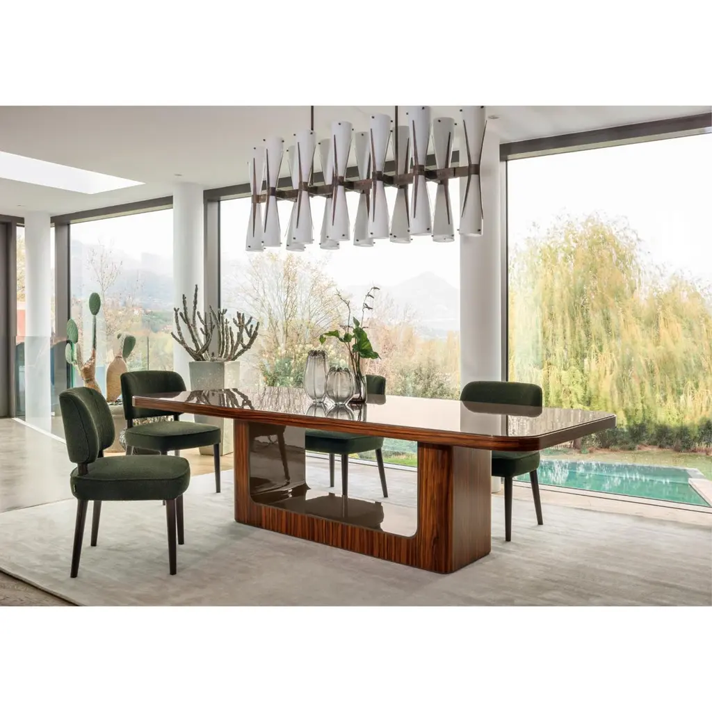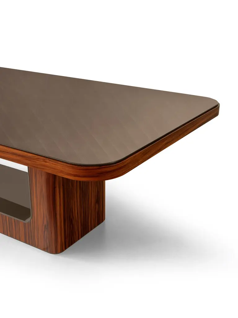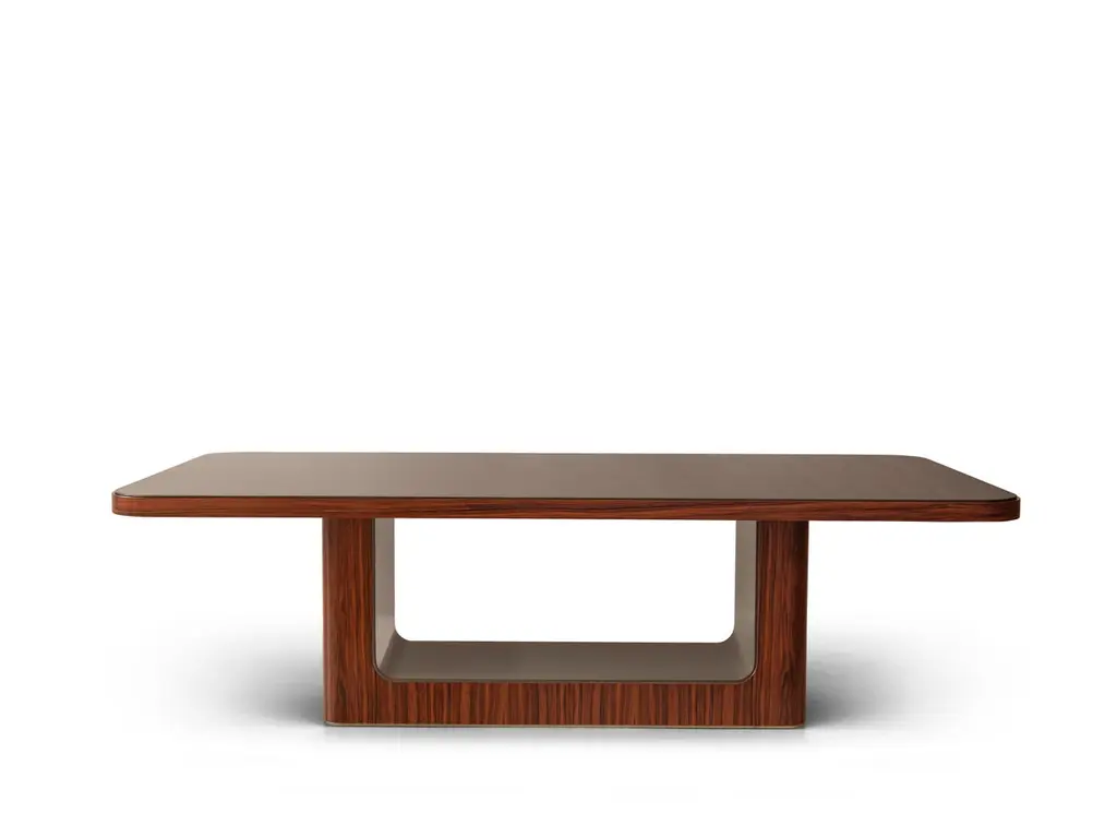 Delano 5029 Table by RedecoDimensions: W 260 x D 125 x H 77 cmMaterials: Lightened mdf base and mdf top. Structure in Palissandro Santos veneer with polyester matt finish and Ebony lacquered polyester high gloss finish. Internal top in Biotite brushed crossed polyester lacquered high gloss finish.ReDéco is a truly solid company, capable of building and creating furnishings, but also a company that can transmit the past and wonderful emotions, experiencing the design of interiors and the evolution of a way of being. Each step leading up to the creation of the final product is subject to meticulous checks and attention, thanks to the management and direct control of the entire production process.