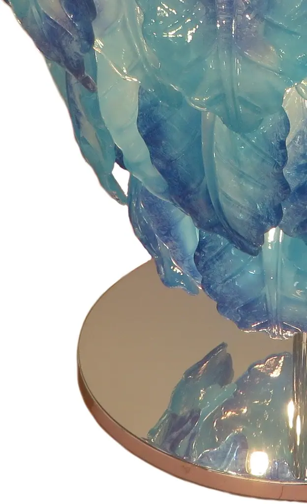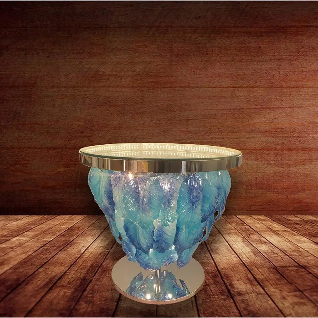 Modern Italian illuminated table with infinity lit mirror, dressed with blue and aquamarine Murano glass leaves mounted on chrome metal base / Designed by Fabio Bergomi for Fabio Ltd / Made in ItalyLED light strip plus 12 sockets G9 type max 40W eachMeasures: Diameter 27.5 inches / height 25.5 inchesOrder only / This item ships from ItalyOrder reference #: FABIOLTD L100 BLUEThe listed price applies to Chrome finish, Gold finish available with upcharge of $1,400.