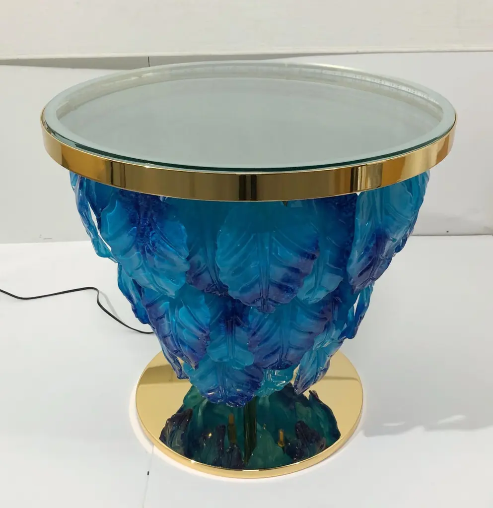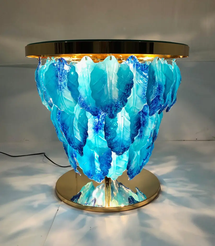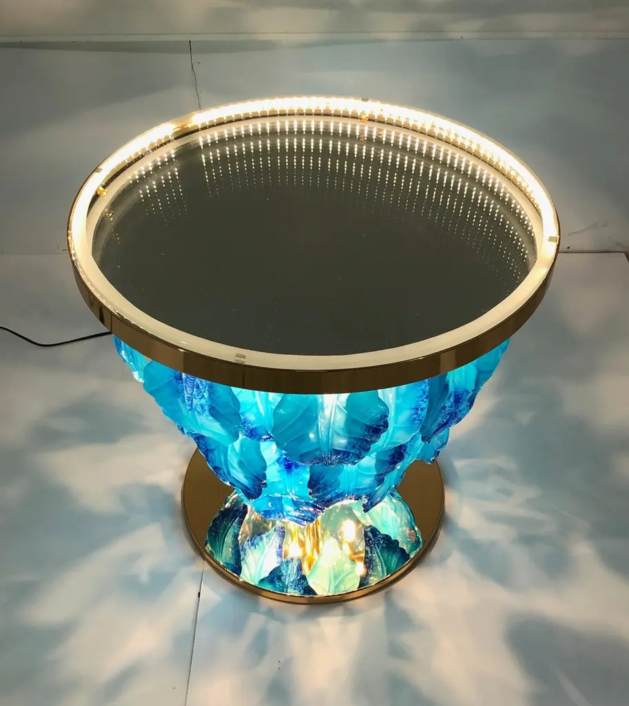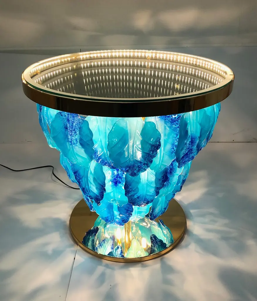 Modern Italian illuminated table with infinity lit mirror, dressed with blue and aquamarine Murano glass leaves mounted on 24K gold plated metal base / Designed by Fabio Bergomi for Fabio Ltd / Made in ItalyLED light strip plus 12 sockets G9 type max 40W eachDiameter: 27.5 inches / Height: 25.5 inchesOrder only / This item ships from ItalyOrder reference #: FABIOLTD L172 BLUE